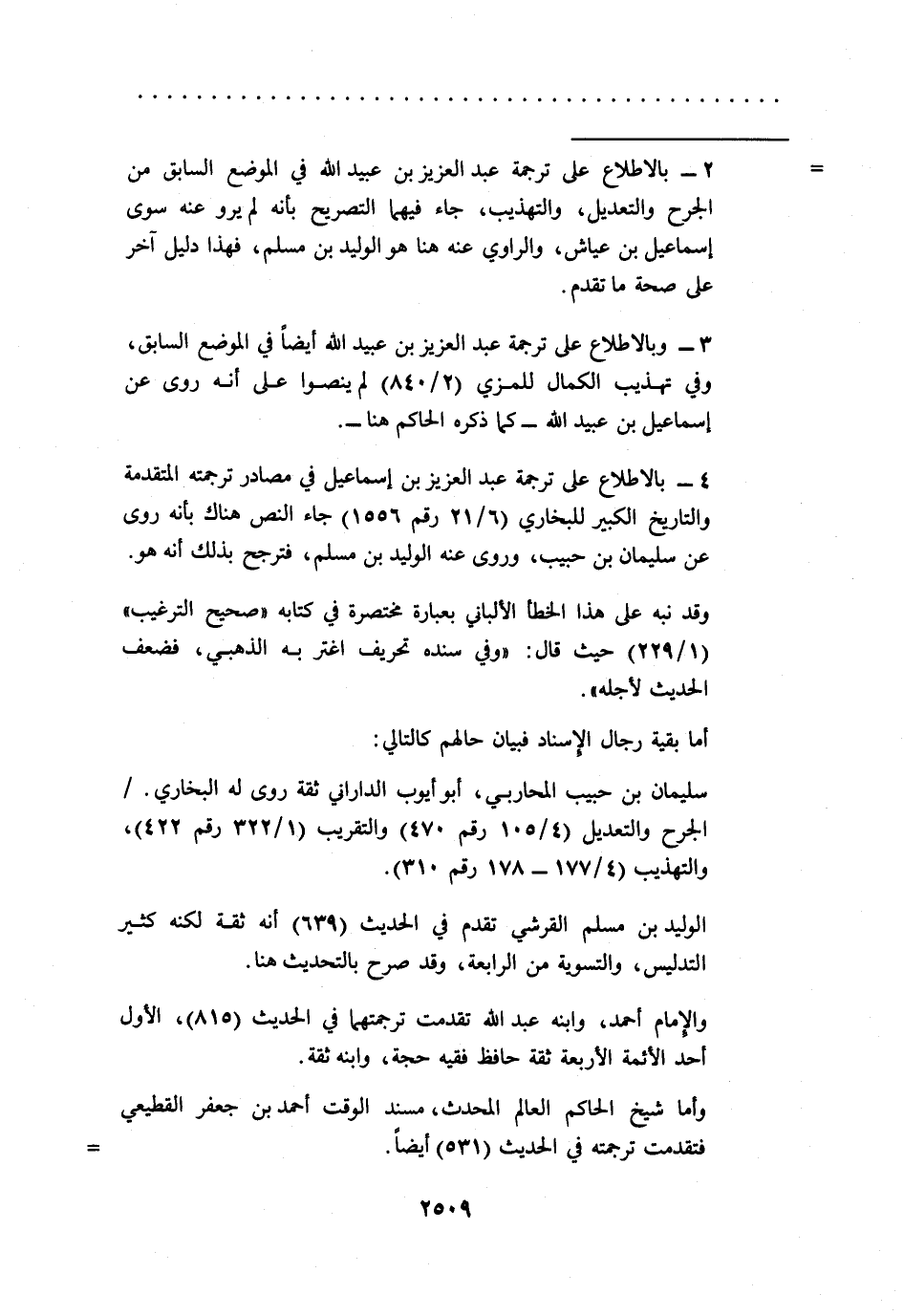 = 2 - بالاطلاع على ترجمة عبد العزيز بن عبيد الله في الموضع السابق من الجرح والتعديل، والتهذيب، جاء فيهما التصريح بأنه لم يرو عنه سوى إسماعيل بن عياش، والراوي عنه هنا هو الوليد بن مسلم، فهذا دليل آخر على صحة ما تقدم.
