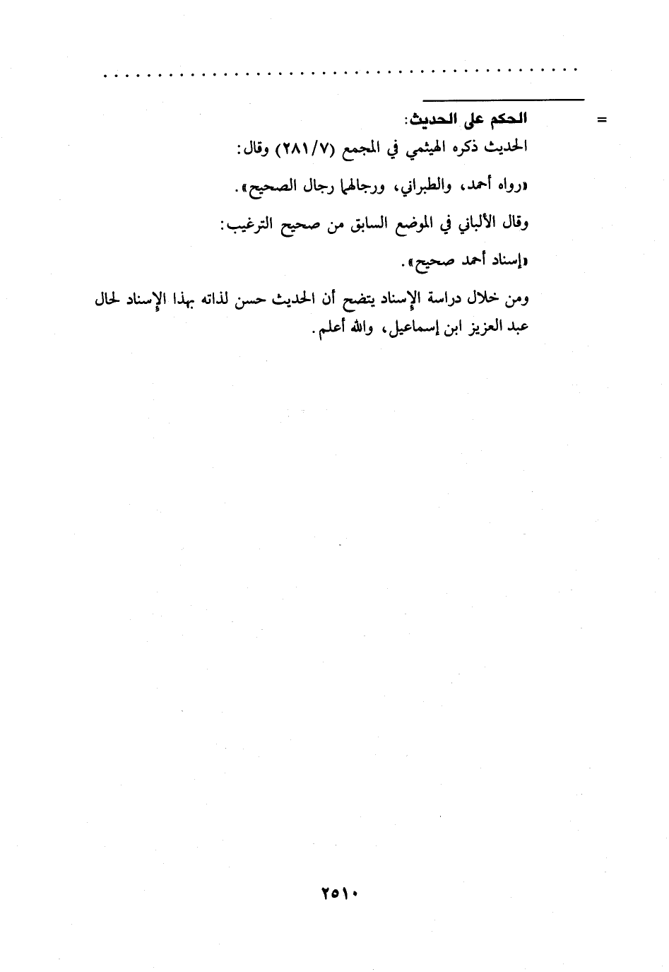 ومن خلال دراسة الإسناد يتضح أن الحديث حسن لذاته بهذا الإسناد لحال عبد العزيز ابن إسماعيل، والله أعلم.