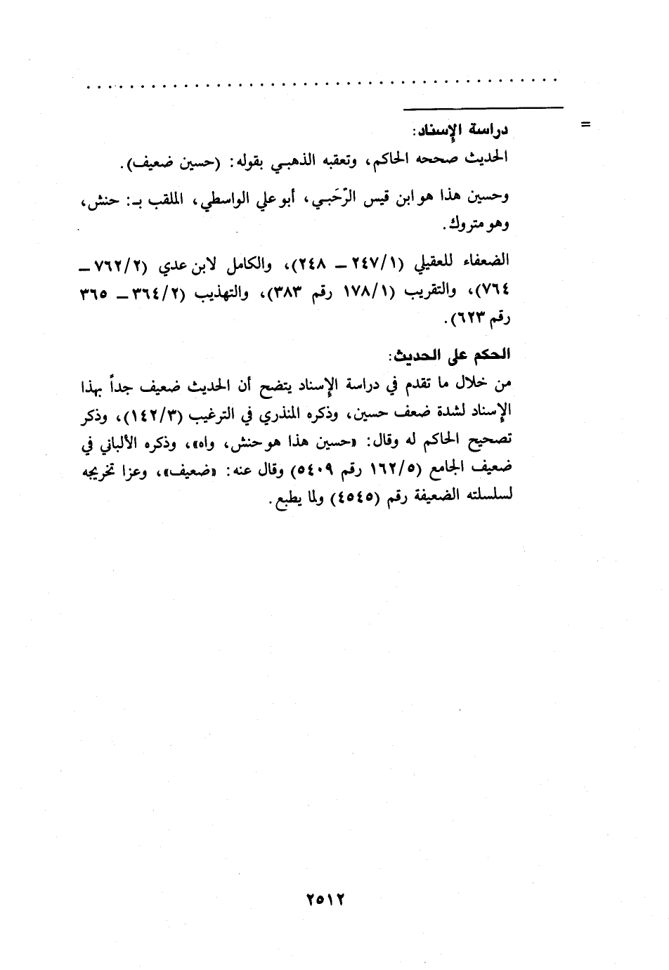 وحسين هذا هو ابن قيس الرّحَبي، أبو علي الواسطي، الملقب بـ: حنش، وهو متروك.