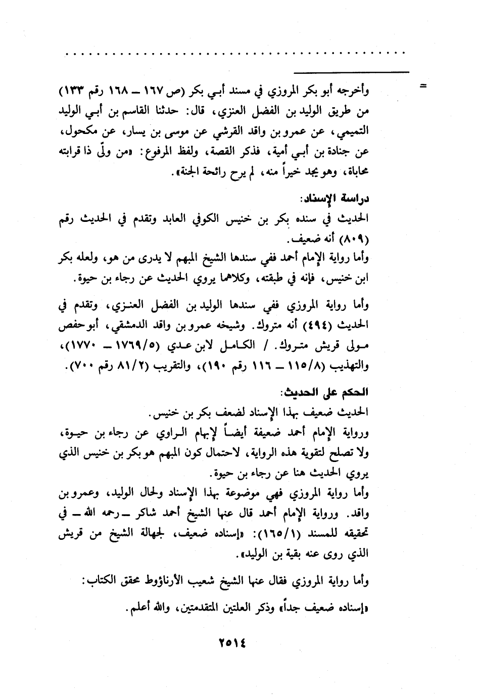 ورواية الإمام أحمد ضعيفة أيضاً لإبهام الراوي عن رجاء بن حيوة، ولا تصلح لتقوية هذه الرواية، لاحتمال كون المبهم هو بكر بن خنيس الذي يروي الحديث هنا عن رجاء بن حيوة.