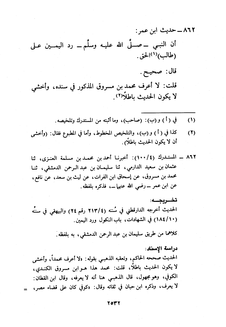 862 - المستدرك (4/ 100): أخبرنا أحمد بن محمد بن مسلمة العنزى، ثنا عثمان بن سعيد الدارمي، ثنا سليمان بن عبد الرحمن الدمشقي، ثنا محمد بن مسروق، عن إسحاق ابن الفرات، عن ليث بن سعد، عن نافع، عن ابن عمر -رضي الله عنهما- فذكره بلفظه.