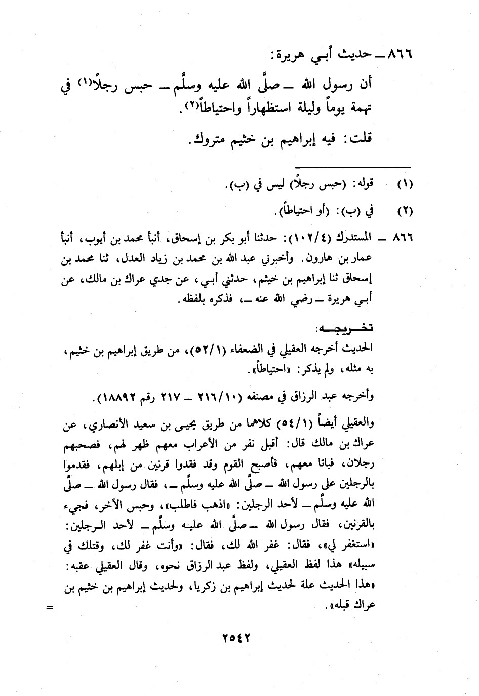 866 - المستدرك (4/ 102): حدثنا أبو بكر بن إسحاق، أنبأ محمد بن أيوب، أنبأ عمار بن هارون. وأخبرني عبد الله بن محمد بن زياد العدل، ثنا محمد بن إسحاق ثنا إبراهيم بن خيثم، حدثني أبي، عن جدي عراك بن مالك، عن أبي هريرة -رضي الله عنه- فذكره بلفظه.