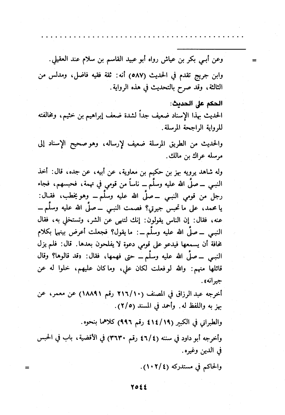 وله شاهد يرويه بهز بن حكيم بن معاوية، عن أبيه، عن جده، قال: أخذ النبي -صلى الله عليه وسلم- ناساً من قومي في تهمة، فحبسهم، فجاء رجل من قومي النبي -صلى الله عليه وسلم- وهو يخطب، فقال: يا محمد، على ما تحبس جيرتي؟ فصمت النبي -صلى الله عليه وسلم- عنه، فقال: إن الناس يقولون: إنك لتنهى عن الشر، وتستخلي به، فقال النبي -صلى الله عليه وسلم-: ما يقول؟ فجعلت أعرض بينهما بكلام مخافة أن يسمعها فيدعو على قومي دعوة لا يفلحون بعدها. قال: فلم يزل النبي -صلى الله عليه وسلم- حتى فهمها، فقال: "قد قالوها؟ وقال قائلها منهم: والله لو فعلت لكان علي، وما كان عليهم، خلوا له عن جيرانه".