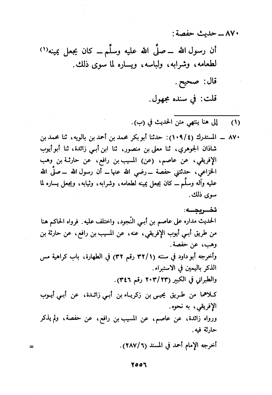 870 - المستدرك (4/ 109): حدثنا أبو بكر محمد بن أحمد بن بالويه، ثنا محمد بن شاذان الجوهري، ثنا معلى بن منصور، ثنا ابن أبي زائدة، ثنا أبو أيوب الإفريقي، عن عاصم، (عن) المسيب بن رافع، عن حارثة بن وهب الخزاعي، حدثتني حفصة -رضي الله عنها- أن رسول الله -صلى الله عليه وآله وسلم- كان يجعل يمينه لطعامه، وشرابه، وثيابه، ويجعل يساره لما سوى ذلك.