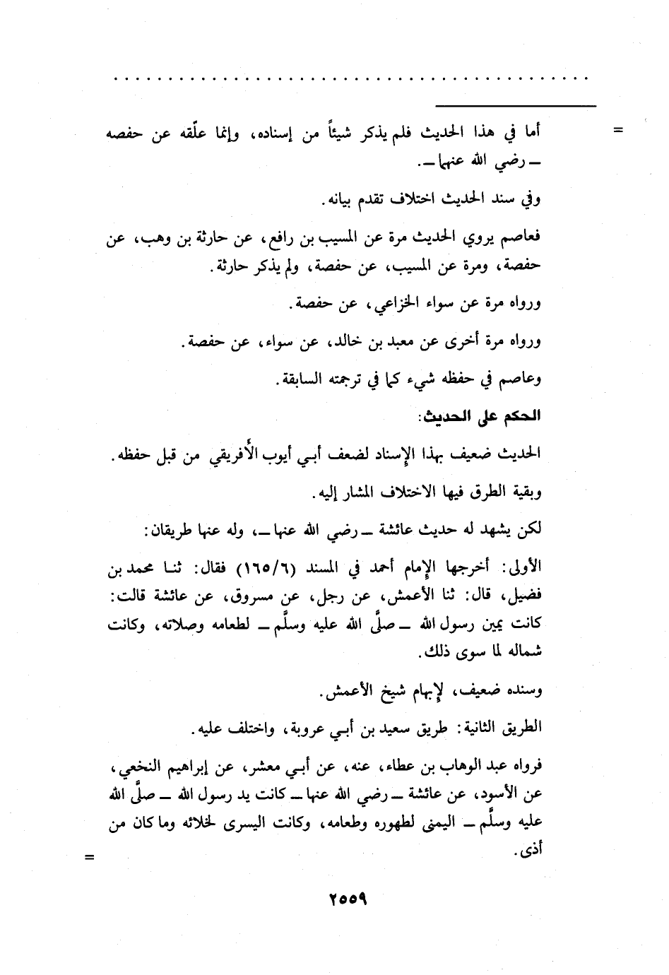 فعاصم يروي الحديث مرة عن المسيب بن رافع، عن حارثة بن وهب، عن حفصة، ومرة عن المسيب، عن حفصة، ولم يذكر حارثة.