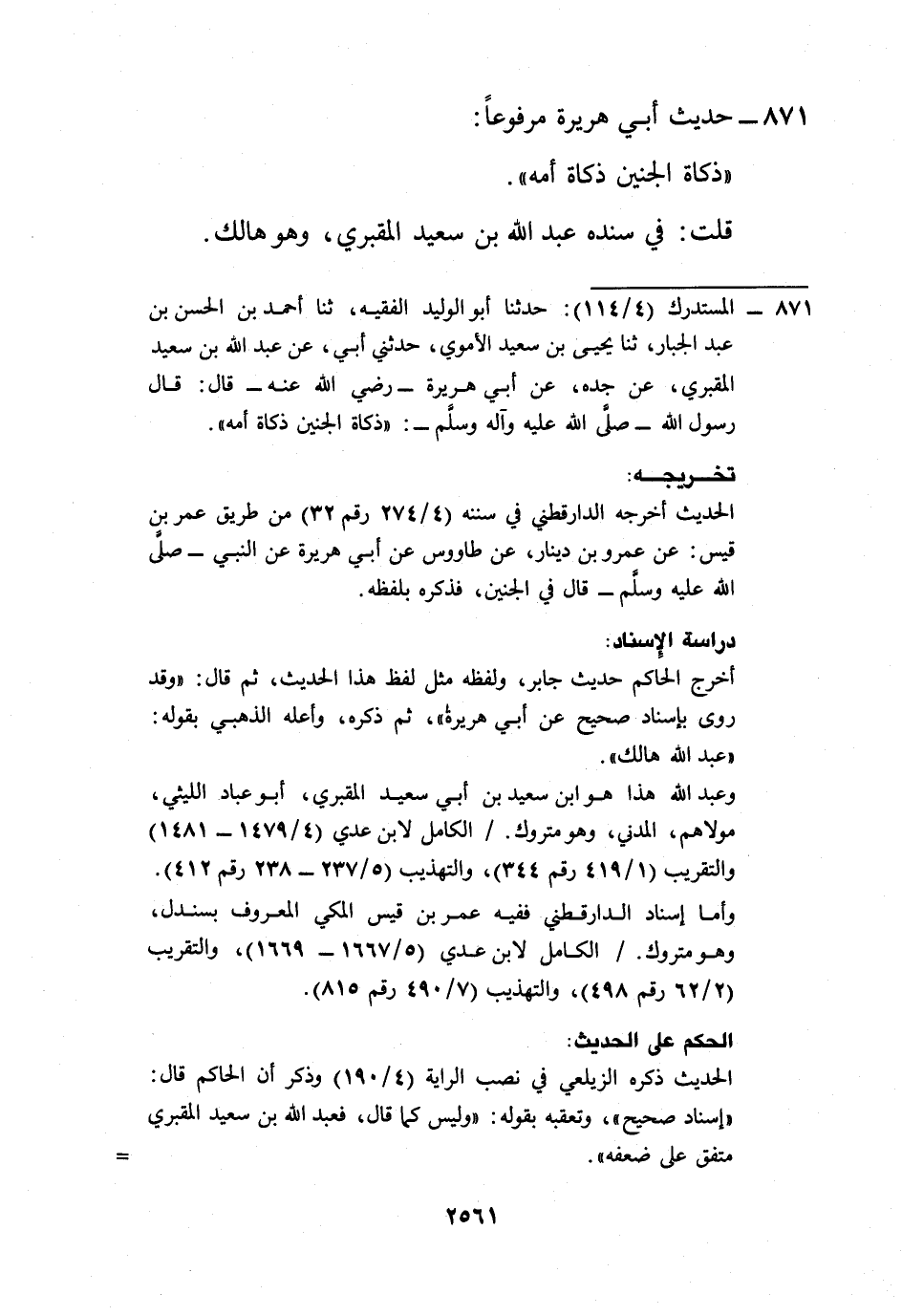 871 - المستدرك (4/ 114): حدثنا أبو الوليد الفقيه، ثنا أحمد بن الحسن بن عبد الجبار، ثنا يحيى بن سعيد الأموي، حدثني أبي، عن عبد الله بن سعيد المقبري، عن جده، عن أبي هريرة -رضي الله عنه- قال: قال رسول الله -صلى الله عليه وآله وسلم-: "ذكاة الجنين ذكاة أمه".