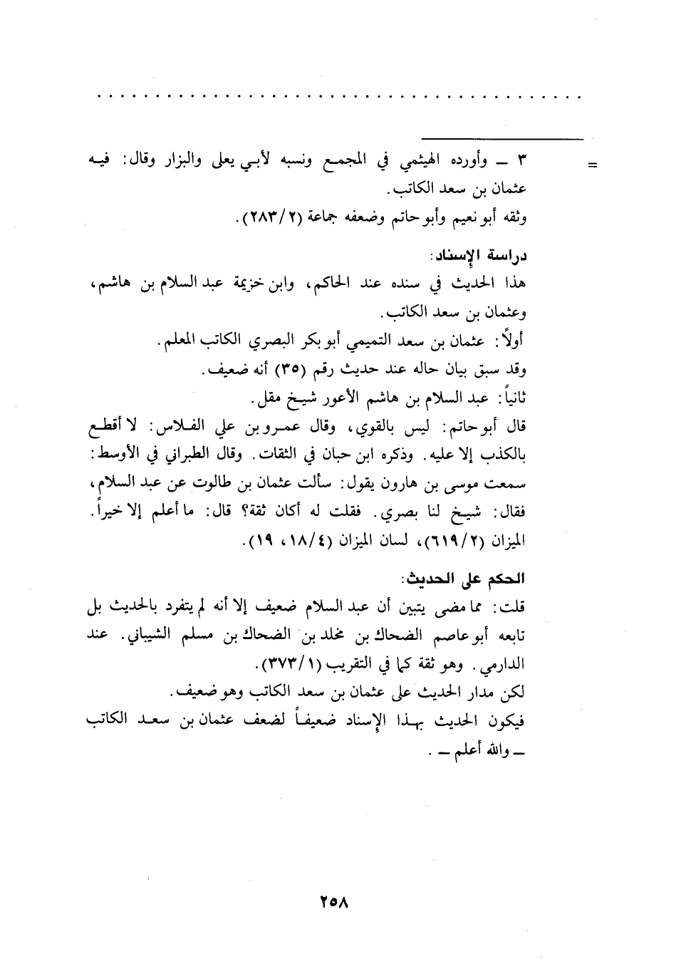 فيكون الحديث بهذا الِإسناد ضعيفاً لضعف عثمان بن سعد الكاتب -والله أعلم-.