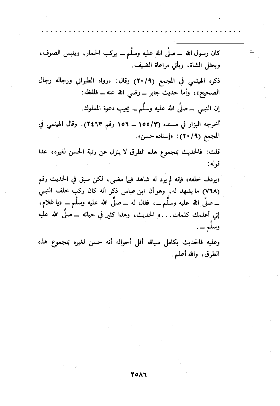 = كان رسول الله -صلى الله عليه وسلم - يركب الحمار، ويلبس الصوف، ويعقل الشاة، ويأتي مراعاة الضيف.