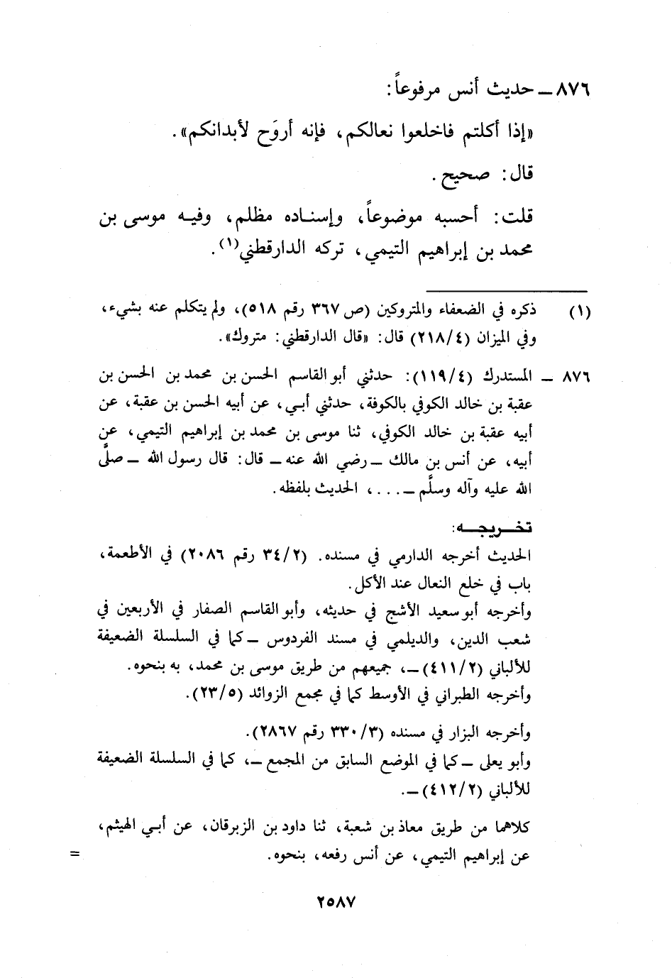 الحديث أخرجه الدارمي في مسنده. (2/ 34رقم2086) في الأطعمة، باب في خلع النعال عند الأكل.