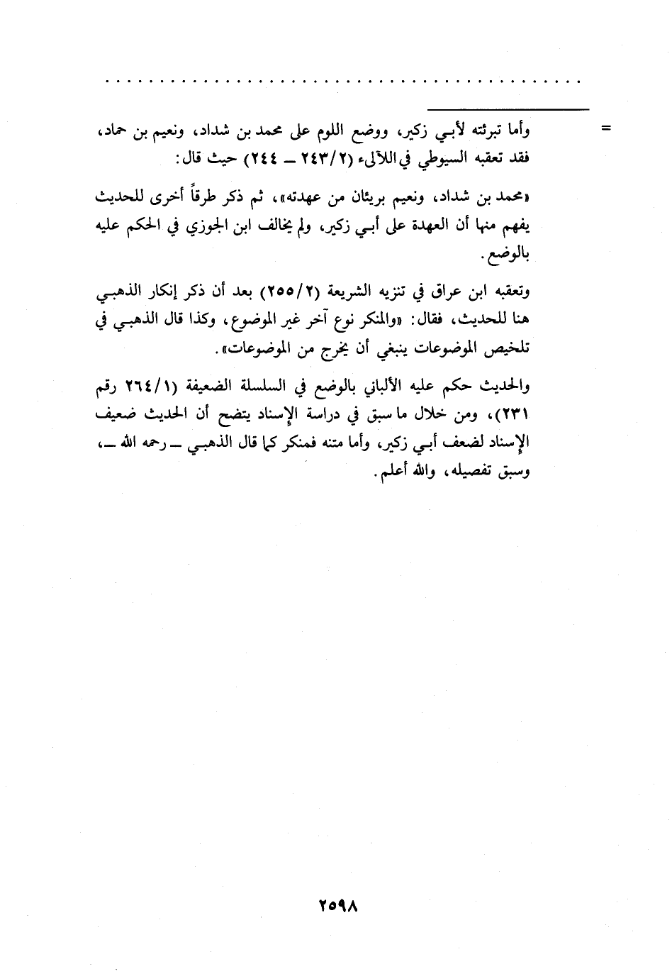 = وأما تبرئته لأبي زكير، ووضع اللوم على محمد بن شداد، ونعيم بن حماد، فقد تعقبه السيوطي في اللآليء (2/ 243 - 244) حيث قال: