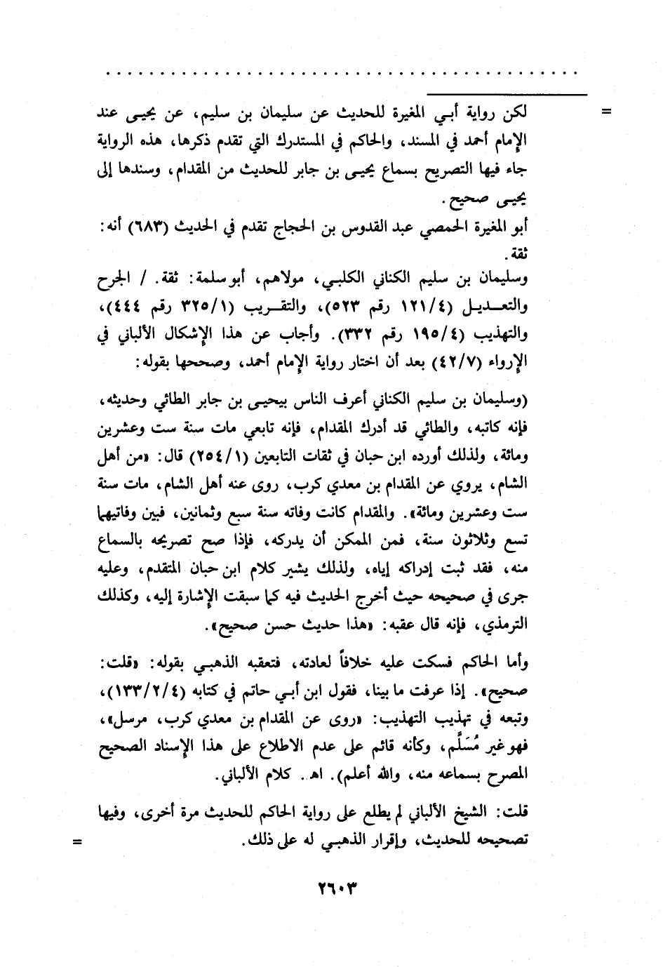 وأما الحاكم فسكت عليه خلافاً لعادته، فتعقبه الذهبي بقوله: "قلت: صحيح". إذا عرفت ما بينا، فقول ابن أبي حاتم في كتابه (4/ 2/ 133)، وتبعه في تهذيب التهذيب: "روى عن المقدام بن معدي كرب، مرسل"، فهو غير مُسَلَّم، وكأنه قائم على عدم الاطلاع على هذا الإسناد الصحيح المصرح بسماعه منه، والله أعلم).اهـ -. كلام الألباني.