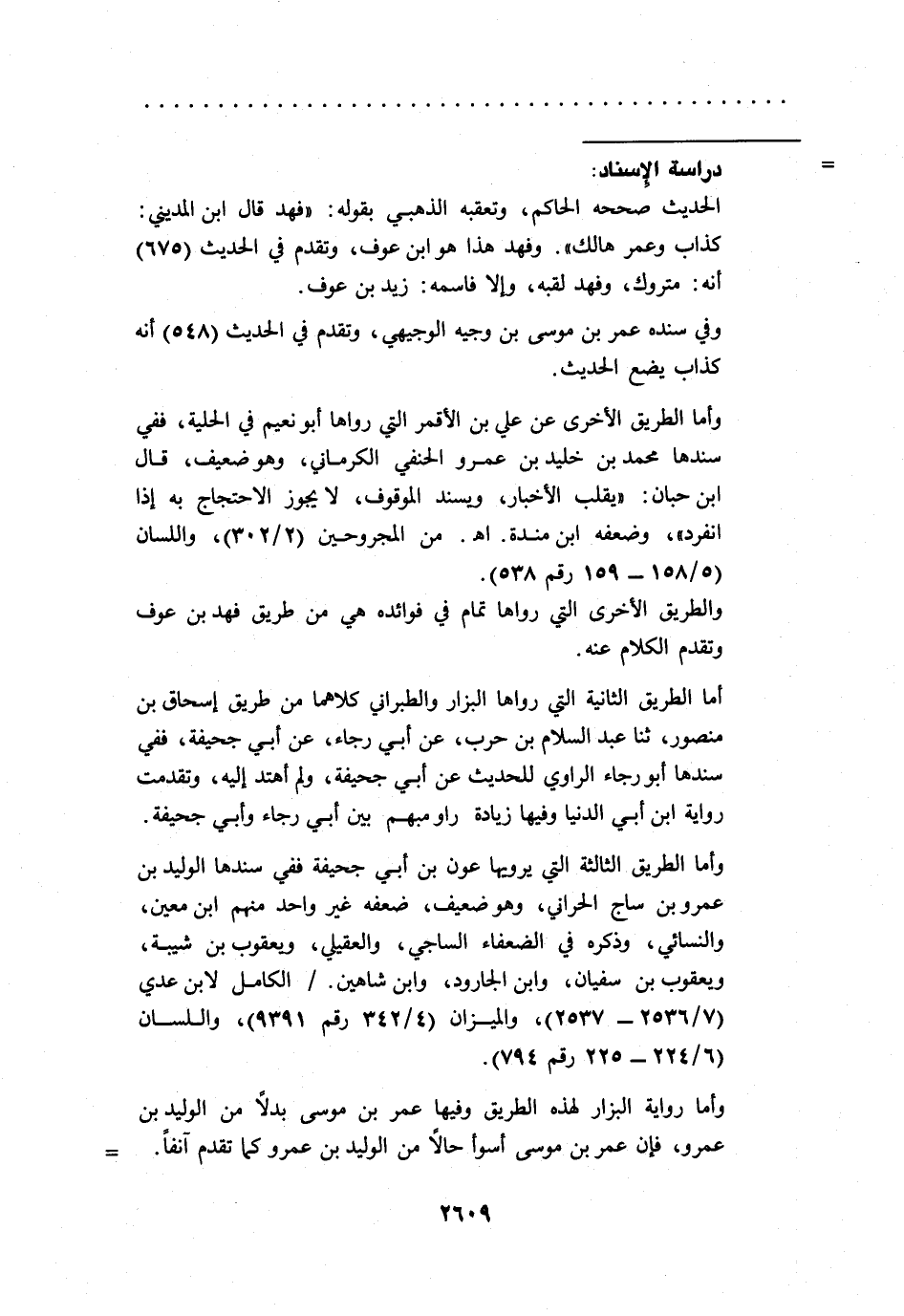 وأما الطريق الثالثة التي يرويها عون بن أبي جحيفة ففي سندها الوليد بن عمرو بن ساج الحراني، وهو ضعيف، ضعفه غير واحد منهم ابن معين، والنسائي، وذكره في الضعفاء الساجي، والعقيلي، ويعقوب بن شيبة، ويعقوب بن سفيان، وابن الجارود، وابن شاهين. / الكامل لابن عدي (7/ 2536 - 2537)، والميزان (4/ 342رقم9391)، واللسان (6/ 224 - 225 رقم 794).