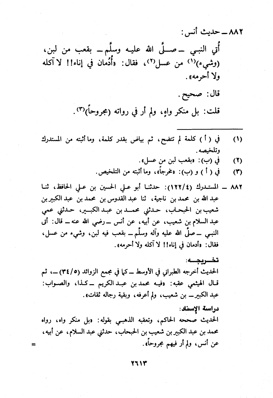 882 - المستدرك (4/ 122): حدثنا أبو علي الحسين بن علي الحافظ، ثنا عبد الله بن محمد بن ناجية، ثنا عبد القدوس بن محمد بن عبد الكبير بن شعيب بن الحبحاب، حدثني محمد بن عبد الكبير، حدثني عمي عبد السلام بن شعيب، عن أبيه، عن أنس -رضي الله عنه- قال: أتى النبي -صلى الله عليه وآله وسلم- بقعب فيه لبن، وشيء من عسل، فقال: "أدمان في إناء!! لا آكله ولا أحرمه".