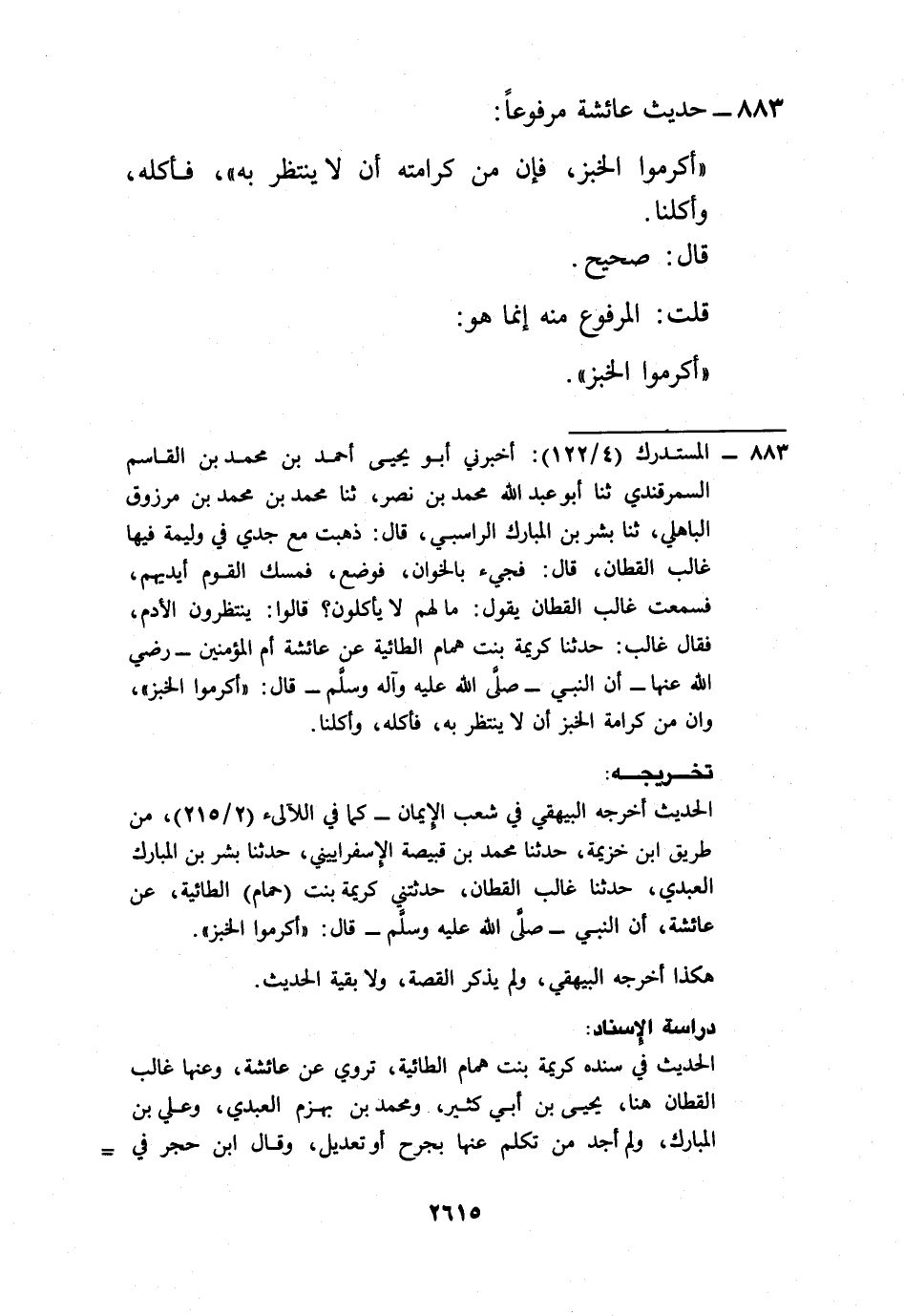 883 - المستدرك (4/ 122): أخبرني أبو يحيى أحمد بن محمد بن القاسم السمرقندي ثنا أبو عبد الله محمد بن نصر، ثنا محمد بن محمد بن مرزوق الباهلي، ثنا بشر بن المبارك الراسبي، قال: ذهبت مع جدي في وليمة فيها غالب القطان، قال: فجيء بالخوان، فوضع، فمسك القوم أيديهم، فسمعت غالب القطان يقول: ما لهم لا يأكلون؟ قالوا: ينتظرون الأدم، فقال غالب: حدثنا كريمة بنت همام الطائية عن عائشة أم المؤمنين -رضي الله عنها- أن النبي -صلى الله عليه وآله وسلم- قال: "أكرموا الخبز"، وإن من كرامة الخبز أن لا ينتظر به، فأكله، وأكلنا.