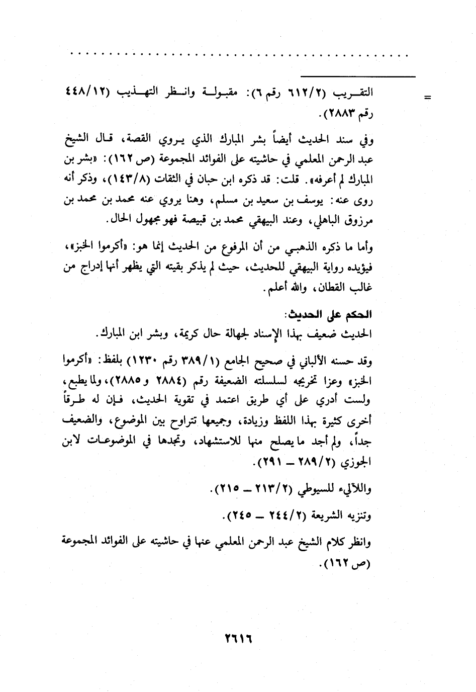 وأما ما ذكره الذهبي من أن المرفوع من الحديث إنما هو: "أكرموا الخبز"، فيؤيده رواية البيهقي للحديث، حيث لم يذكر بقيته التي يظهر أنها إدراج من غالب القطان، والله أعلم.