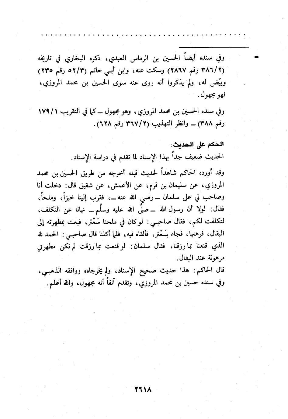 = وفي سنده أيضاً الحسين بن الرماس العبدي، ذكره البخاري في تاريخه (2/ 386رقم 2867) وسكت عنه، وابن أبي حاتم (3/ 52 رقم 235) وبيّض له، ولم يذكروا أنه روى عنه سوى الحسين بن محمد المروزي، فهو مجهول.