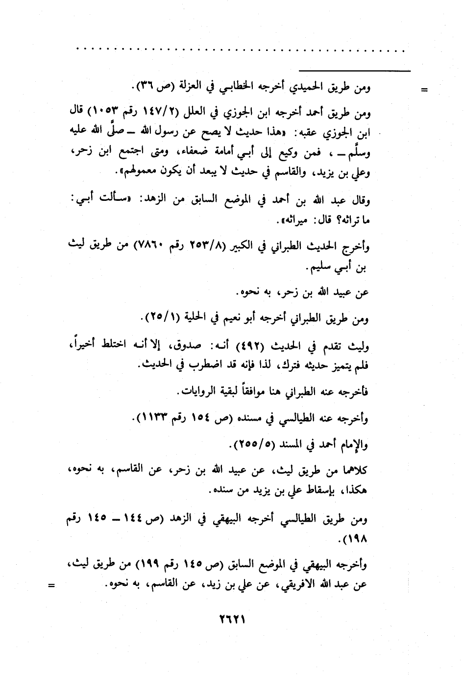 ومن طريق أحمد أخرجه ابن الجوزي في العلل (2/ 147 رقم 1053) قال ابن الجوزي عقبه: "هذا حديث لا يصح عن رسول الله -صلى الله عليه وسلم-، فمن وكيع إلى أبي أمامة ضعفاء، ومتى اجتمع ابن زحر، وعلي بن يزيد، والقاسم في حديث لا يبعد أن يكون معمولهم".