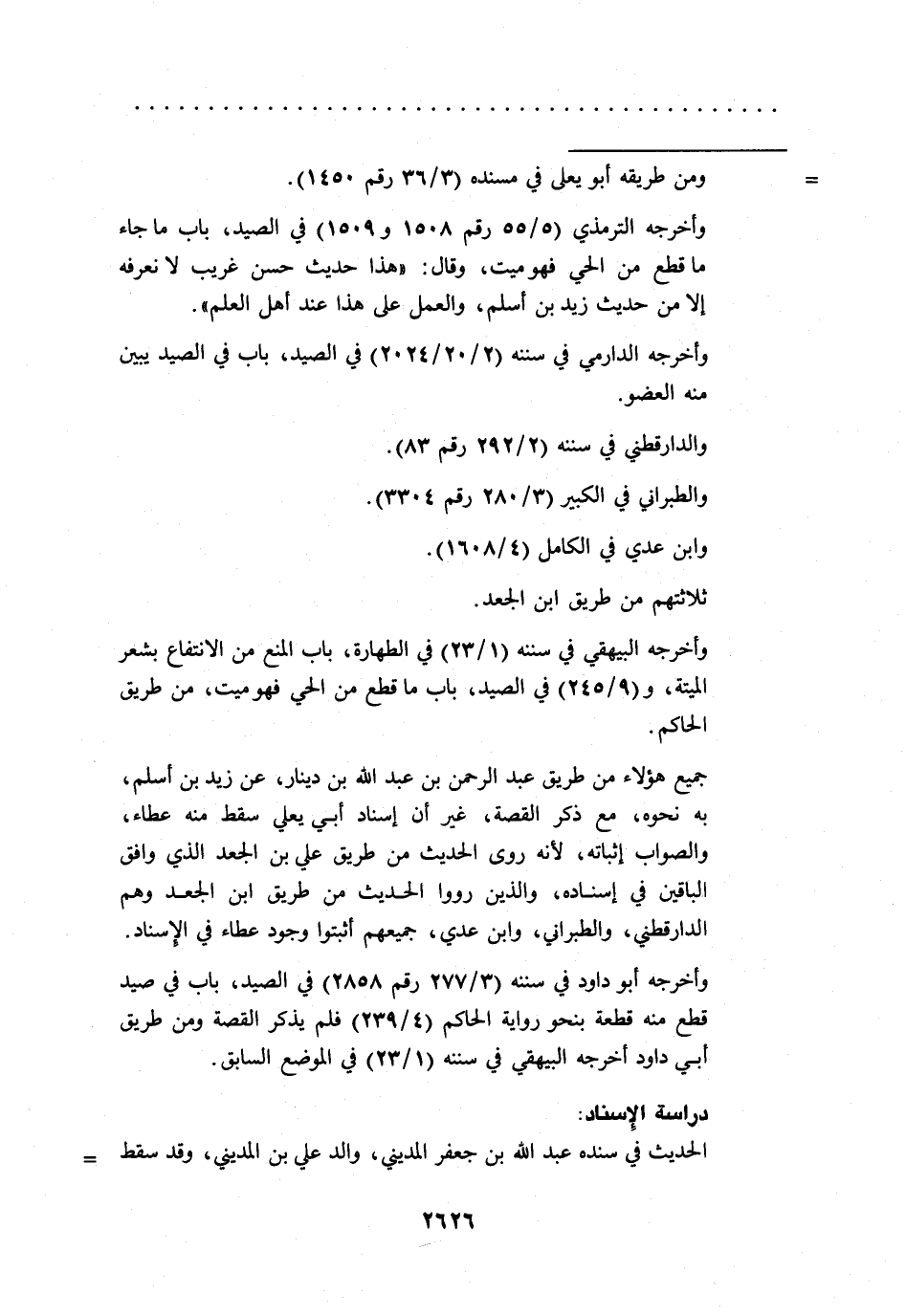 وأخرجه الترمذي (5/ 55رقم 1508 و 1509) في الصيد، باب ما جاء ما قطع من الحي فهو ميت، وقال: "هذا حديث حسن غريب لا نعرفه إلا من حديث زيد بن أسلم، والعمل على هذا عند أهل العلم".