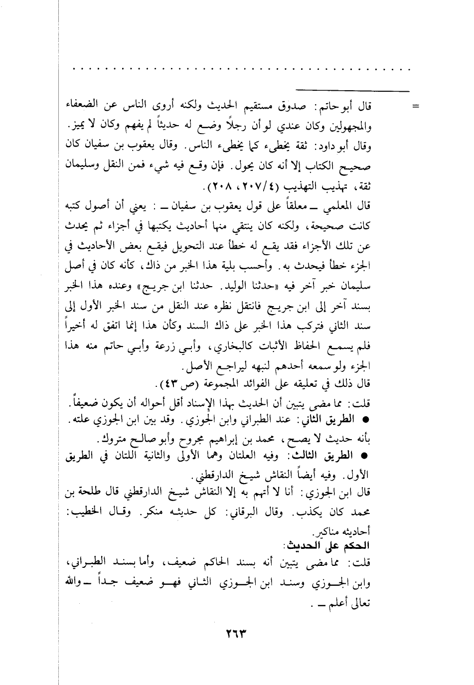 قال المعلمي -معلقاً على قول يعقوب بن سفيان-: يعني أن أصول كتبه كانت صحيحة، ولكنه كان ينتقي منها أحاديث يكتبها في أجزاء ثم يحدث عن تلك الأجزاء فقد يقع له خطأ عند التحويل فيقع بعض الأحاديث في الجزء خطأ فيحدث به. وأحسب بلية هذا الخبر من ذاك، كأنه كان في أصل سليمان خبر آخر فيه "حدثنا الوليد. حدثنا ابن جريج " وعنده هذا الخبر بسند آخر إلى ابن جريج فانتقل نظره عند النقل من سند الخبر الأول إلى سند الثاني فتركب هذا الخبر على ذاك السند وكأن هذا إنما اتفق له أخيراً فلم يسمع الحفاظ الأثبات كالبخاري، وأبي زرعة وأبي حاتم منه هذا الجزء ولو سمعه أحدهم لنبهه ليراجع الأصل.