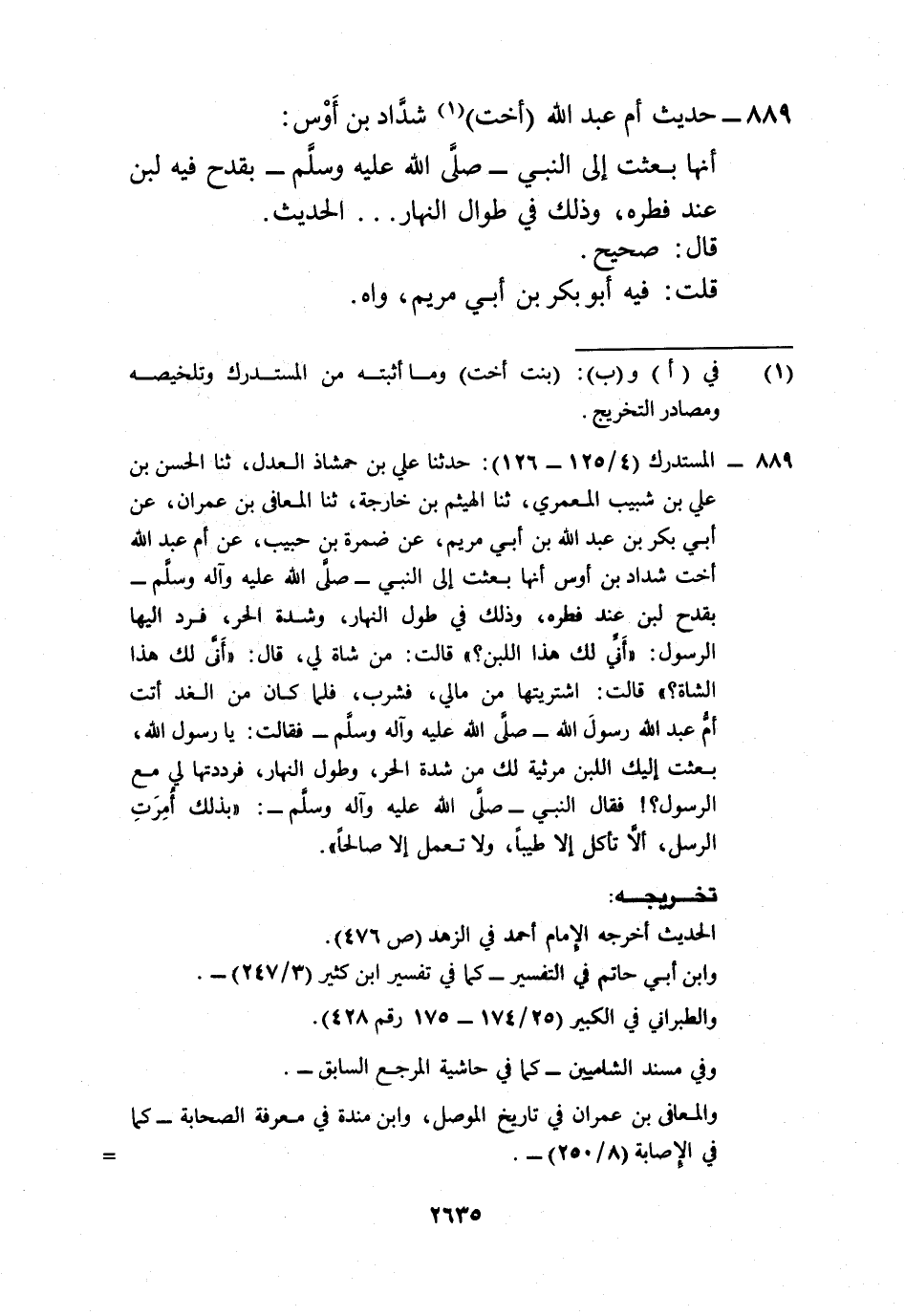 889 - المستدرك (4/ 125 - 126): حدثنا علي بن حمشاذ العدل، ثنا الحسن بن علي بن شبيب المعمري، ثنا الهيثم بن خارجة، ثنا المعافى بن عمران، عن أبي بكر بن عبد الله بن أبي مريم، عن ضمرة بن حبيب، عن أم عبد الله أخت شداد بن أوس أنها بعثت إلى النبي -صلى الله عليه وآله وسلم- بقدح لبن عند فطره، وذلك في طول النهار، وشدة الحر، فرد إليها الرسول: "أَنَّى لك هذا اللبن؟ " قالت: من شاة لي، قال: "أَني لك هذا الشاة؟ " قالت: اشتريتها من مالي، فشرب، فلما كان من الغد أتت أم عبد الله رسولَ الله -صلى الله عليه وآله وسلم- فقالت: يا رسول الله، بعثت إليك اللبن مرثية لك من شدة الحر، وطول النهار، فرددتها لي مع الرسول؟! فقال النبي -صلى الله عليه وآله وسلم-: "بذلك أُمِرَتِ الرسل، ألا تأكل إلا طيباً، ولا تعمل إلا صالحاً".