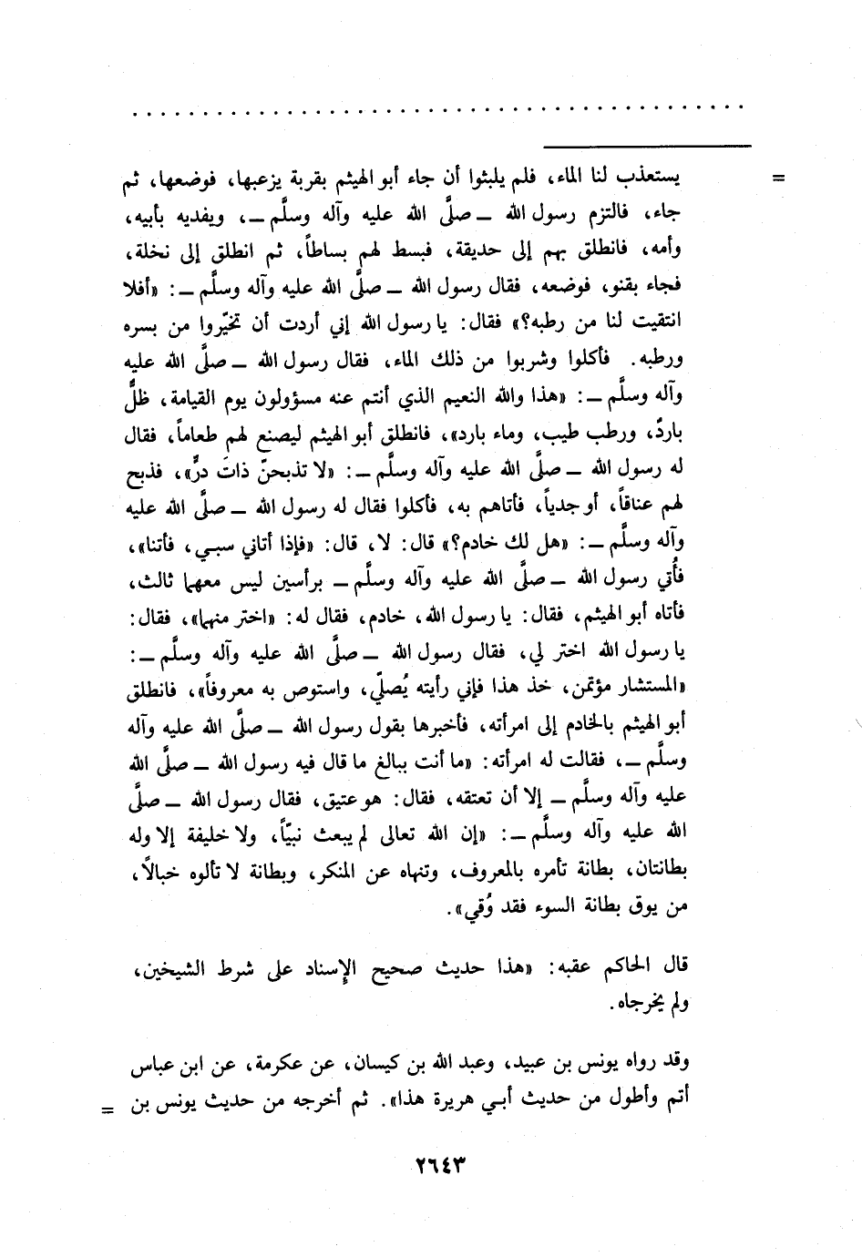 = يستعذب لنا الماء، فلم يلبثوا أن جاء أبو الهيثم بقربة يزعبها، فوضعها، ثم جاء، فالتزم رسول الله -صلى الله عليه وآله وسلم-، ويفديه بأبيه، وأمه، فانطلق بهم إلى حديقة، فبسط لهم بساطاً، ثم انطلق إلى نخلة، فجاء بقنو، فوضعه، فقال رسول الله -صلى الله عليه وآله وسلم-: "أفلا انتقيت لنا من رطبه؟ " فقال: يا رسول الله إني أردت أن تخيّروا من بسره ورطبه. فأكلوا وشربوا من ذلك الماء، فقال رسول الله -صلى الله عليه وآله وسلم-: "هذا والله النعيم الذي أنتم عنه مسؤولون يوم القيامة، ظلٌّ باردٌ، ورطب طيب، وماء بارد"، فانطلق أبو الهيثم ليصنع لهم طعاماً، فقال له رسول الله -صلى الله عليه وآله وسلم-: "لا تذبحنّ ذاتَ درٍّ"، فذبح لهم عناقاً، أو جدياً، فأتاهم به، فأكلوا فقال له رسول الله -صلى الله عليه وآله وسلم-:"هل لك خادم؟ " قال: لا، قال: "فإذا أتاني سبي، فأتنا"، فأُتي رسول الله -صلى الله عليه وآله وسلم- برأسين ليس معهما ثالث، فأتاه أبو الهيثم، فقال: يا رسول الله، خادم، فقال له: "اختر منهما"، فقال: يا رسول الله اختر لي، فقال رسول الله -صلى الله عليه وآله وسلم-: "المستشار مؤتمن، خذ هذا فإني رأيته يُصلّي، واستوص به معروفاً"، فانطلق أبو الهيثم بالخادم إلى امرأته، فأخبرها بقول رسول الله -صلى الله عليه وآله وسلم-، فقالت له امرأته: "ما أنت ببالغ ما قال فيه رسول الله -صلى الله عليه وآله وسلم- إلا أن تعتقه، فقال: هو عتيق، فقال رسول الله -صلى الله عليه وآله وسلم-: "إن الله تعالى لم يبعث نبيّاً، ولا خليفة إلا وله بطانتان، بطانة تأمره بالمعروف، وتنهاه عن المنكر، وبطانة لا تألوه خبالاً، من يوق بطانة السوء فقد وُقي".