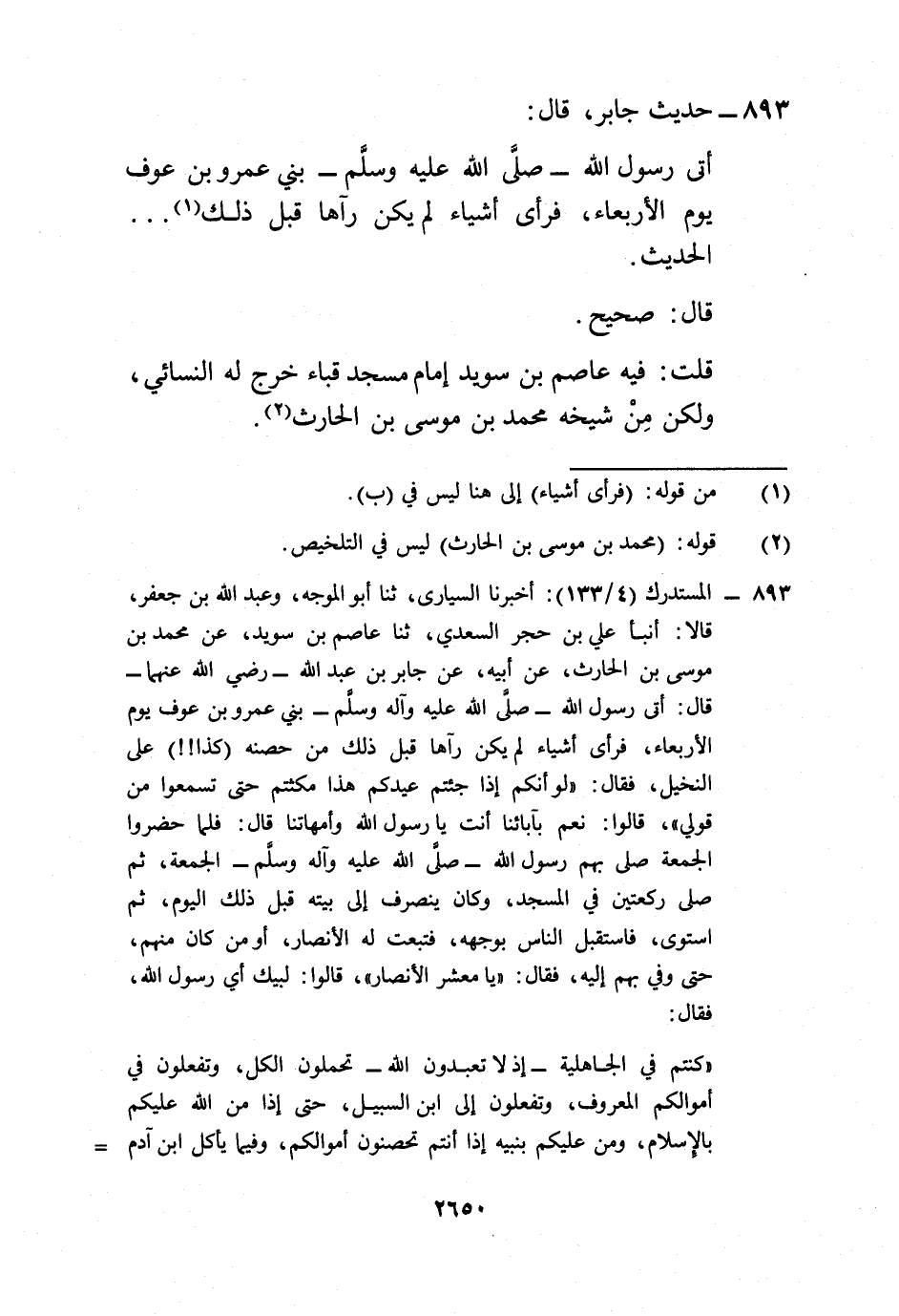 893 - المستدرك (4/ 133): أخبرنا السيارى، ثنا أبو الموجه، وعبد الله بن جعفر، قالا: أنبأ علي بن حجر السعدي، ثنا عاصم بن سويد، عن محمد بن موسى بن الحارث، عن أبيه، عن جابر بن عبد الله -رضي الله عنهما- قال: أتى رسول الله -صلى الله عليه وآله وسلم- بني عمرو بن عوف يوم الأربعاء، فرأى أشياء لم يكن رآها قبل ذلك من حصنه (كذا!!) على النخيل، فقال: "لو أنكم إذا جئتم عيدكم هذا مكثتم حتى تسمعوا من قولي"، قالوا: نعم بآبائنا أنت يا رسول الله وأمهاتنا قال: فلما حضروا الجمعة صلى بهم رسول الله -صلى الله عليه وآله وسلم- الجمعة، ثم صلى ركعتين في المسجد، وكان ينصرف إلى بيته قبل ذلك اليوم، ثم استوى، فاستقبل الناس بوجهه، فتبعت له الأنصار، أو من كان منهم، حتى وفي بهم إليه، فقال: "يا معشر الأنصار"، قالوا: لبيك أي رسول الله، فقال: