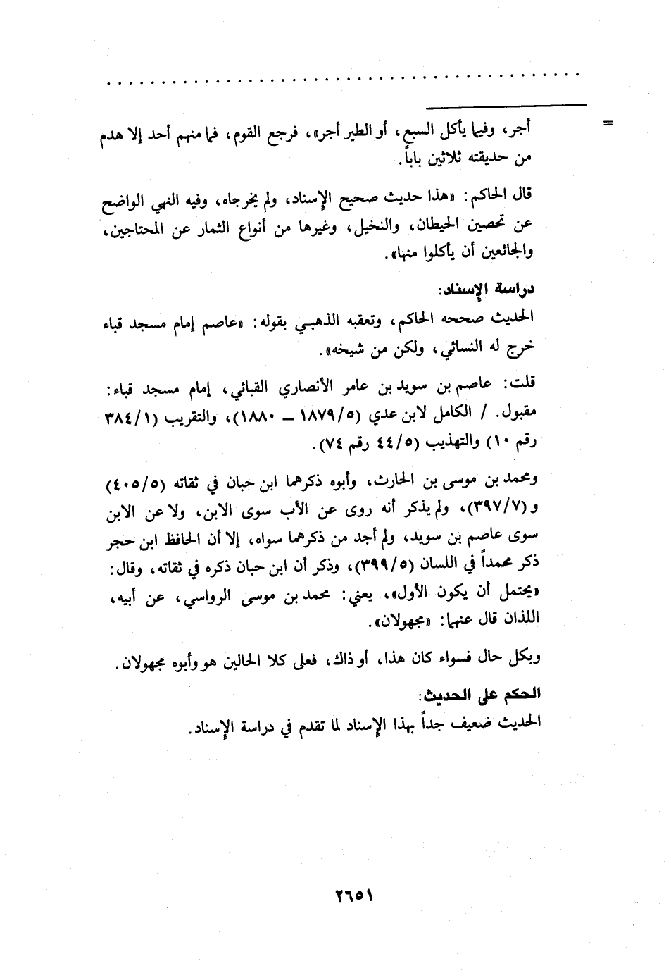 قال الحاكم: "هذا حديث صحيح الإسناد، ولم يخرجاه، وفيه النهي الواضح عن تحصين الحيطان، والنخيل، وغيرها من أنواع الثمار عن المحتاجين، والجائعين أن يأكلوا منها".