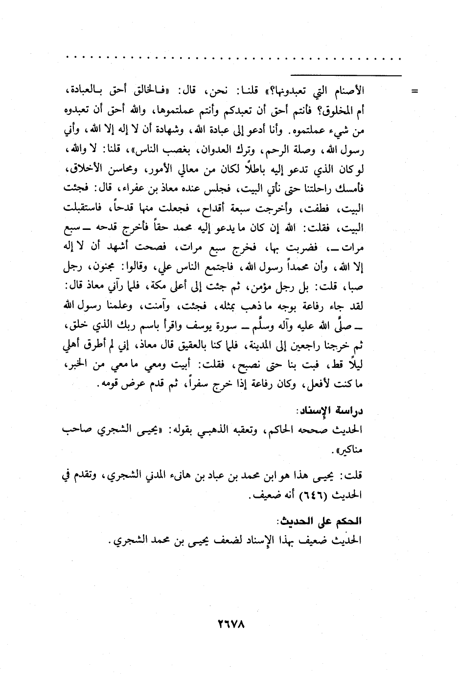 = الأصنام التي تعبدونها؟ " قلنا: نحن، قال: "فالخالق أحق بالعبادة، أم المخلوق؟ فأنتم أحق أن تعبدكم وأنتم عملتموها، والله أحق أن تعبدوه من شيء عملتموه. وأنا أدعو إلى عبادة الله، وشهادة أن لا إله إلا الله، وأني رسول الله، وصلة الرحم، وترك العدوان، بغصب الناس"، قلنا: لا والله، لو كان الذي تدعو إليه باطلًا لكان من معالي الأمور، ومحاسن الأخلاق، فأمسك راحلتنا حتى نأتي البيت، فجلس عنده معاذ بن عفراء، قال: فجئت البيت، فطفت، وأخرجت سبعة أقداح، فجعلت منها قدحاً، فاستقبلت البيت، فقلت: الله إن كان ما يدعو إليه محمد حقاً فأخرج قدحه -سبع مرات-، فضربت بها، فخرج سبع مرات، فصحت أشهد أن لا إله إلا الله، وأن محمداً رسول الله، فاجتمع الناس علي، وقالوا: مجنون، رجل صبا، قلت: بل رجل مؤمن، ثم جثت إلى أعلى مكة، فلما رآني معاذ قال: لقد جاء رفاعة بوجه ماذهب بمثله، فجئت، وآمنت، وعلمنا رسول الله -صلى الله عليه وآله وسلم- سورة يوسف واقرأ باسم ربك الذي خلق، ثم خرجنا راجعين إلى المدينة، فلما كنا بالعقيق قال معاذ، إني لم أطرق أهلي ليلاً قط، فبت بنا حتى نصبح، فقلت: أبيت ومعي ما معي من الخبر، ما كنت لأفعل، وكان رفاعة إذا خرج سفراً، ثم قدم عرض قومه.