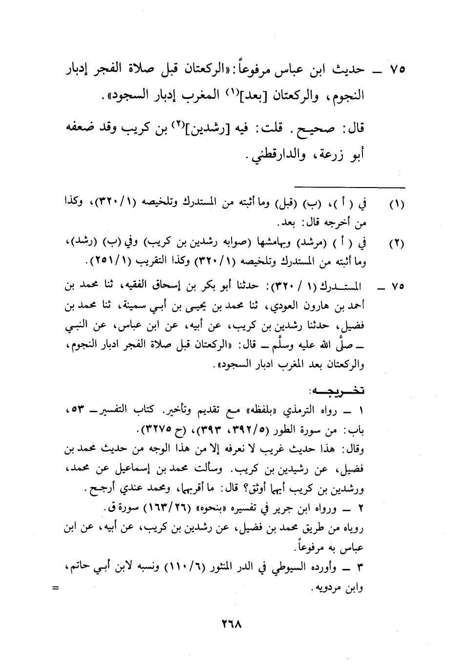 75 - المستدرك (1/ 320): حدثنا أبو بكر بن إسحاق الفقيه، ثنا محمد بن أحمد بن هارون العودي، ثنا محمد بن يحيى بن أبي سمينة، ثنا محمد بن فضيل، حدثنا رشدين بن كريب، عن أبيه، عن ابن عباس، عن النبي -صلى الله عليه وسلم- قال: "الركعتان قبل صلاة الفجر إدبار النجوم، والركعتان بعد المغرب إدبار السجود".