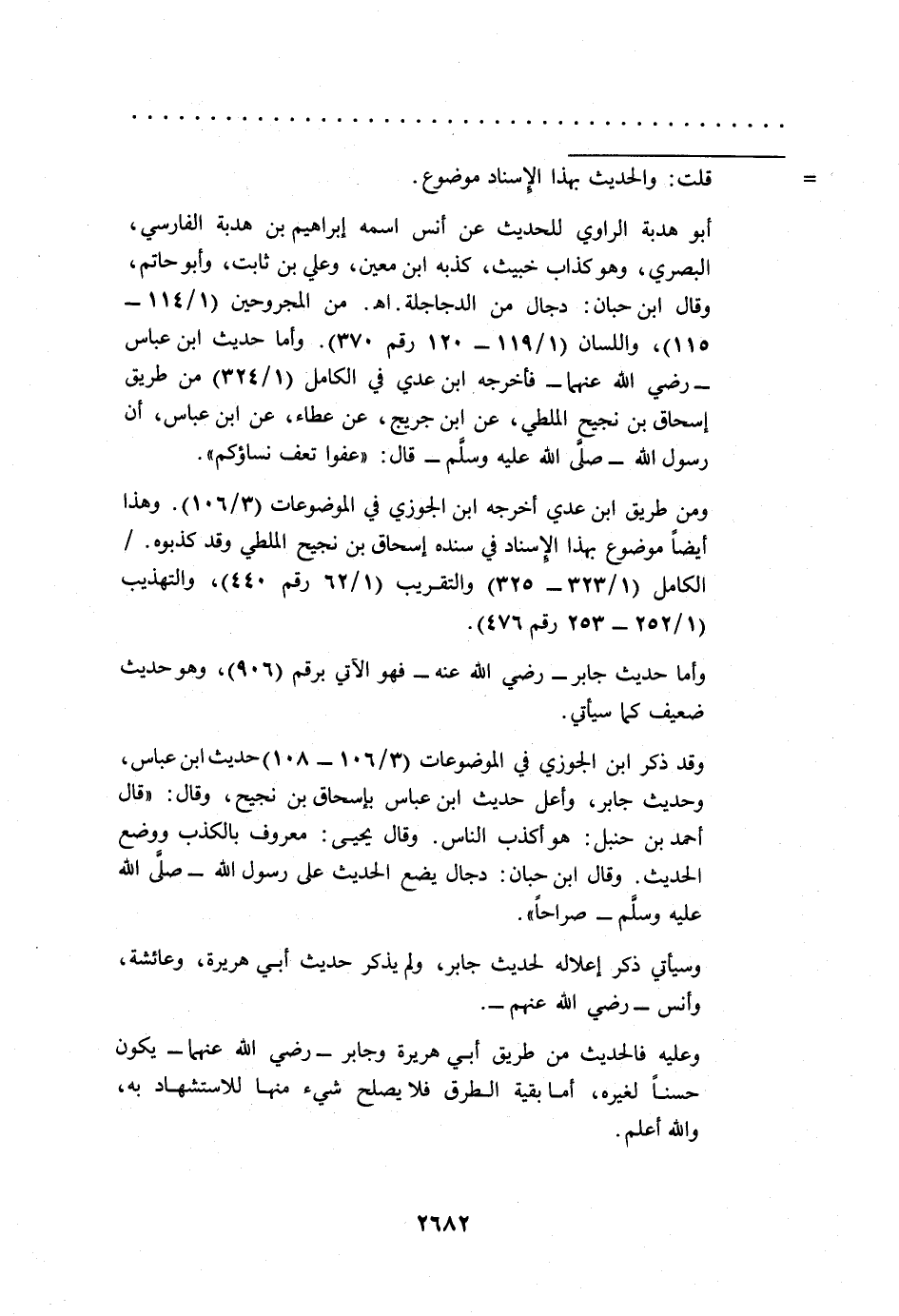 أبو هدبة الراوي للحديث عن أنس اسمه إبراهيم بن هدبة الفارسي، البصري، وهو كذاب خبيث، كذبه ابن معين، وعلي بن ثابت، وأبو حاتم، وقال ابن حبان: دجال من الدجاجلة. اهـ. من المجروحين (1/ 114 - 115)، واللسان (1/ 119 - 120 رقم 370). وأما حديث ابن عباس -رضي الله عنهما- فأخرجه ابن عدي في الكامل (1/ 324) من طريق إسحاق بن نجيع الملطي، عن ابن جريج، عن عطاء، عن ابن عباس، أن رسول الله -صلى الله عليه وسلم- قال: "عفوا تعف نساؤكم".