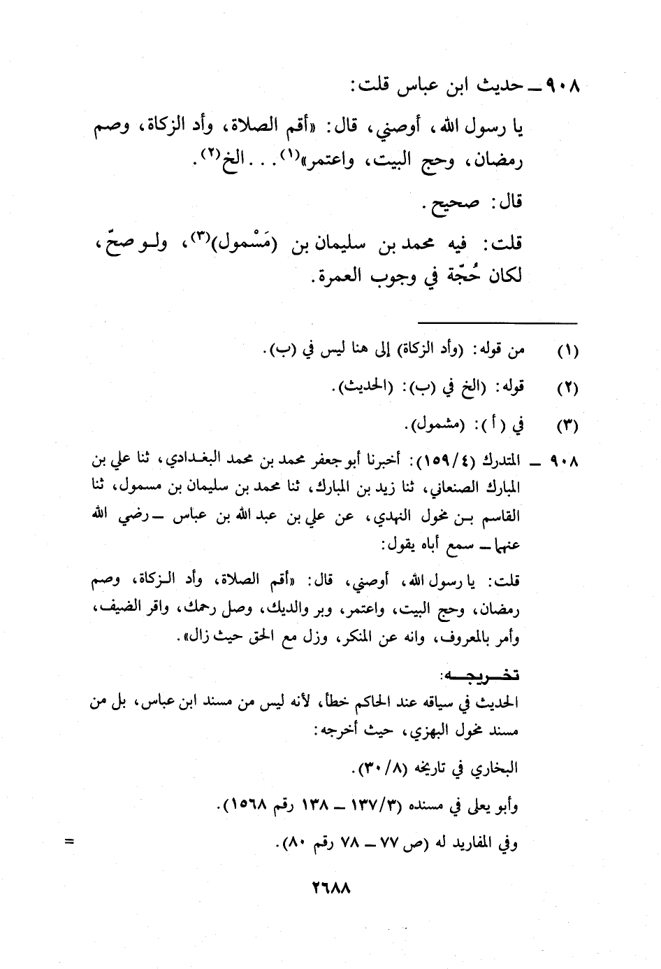 908 - المستدرك (4/ 159): أخبرنا أبو جعفر محمد بن محمد البغدادي، ثنا علي بن المبارك الصنعاني، ثنا زيد بن المبارك، ثنا محمد بن سليمان بن مسمول، ثنا القاسم بن مخول النهدي، عن علي بن عبد الله بن عباس -رضي الله عنهما- سمع أباه يقول: