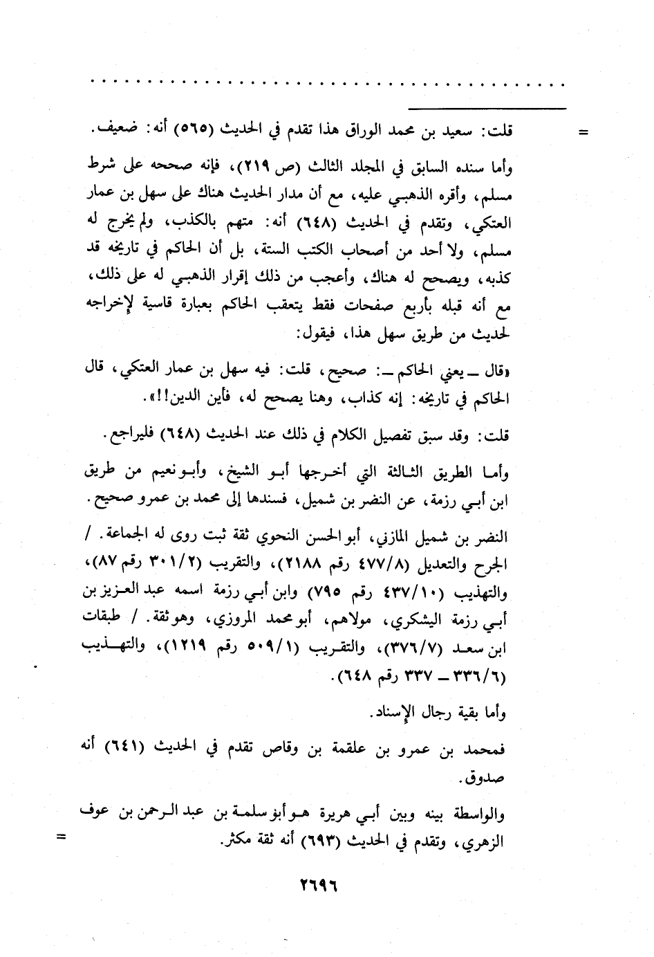 وأما سنده السابق في المجلد الثالث (ص 219)، فإنه صححه على شرط مسلم، وأقره الذهبي عليه، مع أن مدار الحديث هناك على سهل بن عمار العتكي، وتقدم في الحديث (648) أنه: متهم بالكذب، ولم يخرج له مسلم، ولا أحد من أصحاب الكتب الستة، بل أن الحاكم في تاريخه قد كذبه، ويصحح له هناك، وأعجب من ذلك إقرار الذهبي له على ذلك، مع أنه قبله بأربع صفحات فقط يتعقب الحاكم بعبارة قاسية لِإخراجه الحديث من طريق سهل هذا، فيقول: