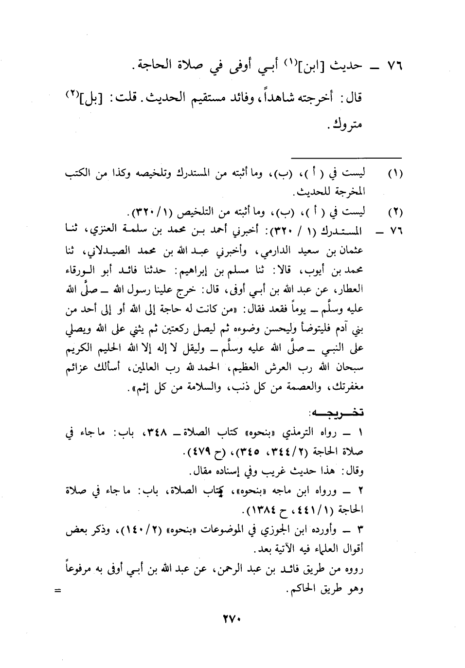 76 - المستدرك (1/ 320): أخبرني أحمد بن محمد بن سلمة العنزي، ثنا عثمان بن سعيد الدارمي، وأخبرني عبد الله بن محمد الصيدلاني، ثنا محمد بن أيوب، قالا: ثنا مسلم بن إبراهيم: حدثنا فائد أبو الورقاء العطار، عن عبد الله بن أبي أوفى، قال: خرج علينا رسول الله -صلَّى الله عليه وسلَّم- يوماً فقعد فقال: "من كانت له حاجة إلى الله أو إلى أحد من بني آدم فليتوضأ وليحسن وضوءه ثم ليصل ركعتين ثم يثني على الله ويصلي على النبي -صلى الله عليه وسلم- وليقل لا إله إلا الله الحليم الكريم سبحان الله رب العرش العظيم، الحمد لله رب العالمين، أسألك عزائم مغفرتك، والعصمة من كل ذنب، والسلامة من كل إثم".