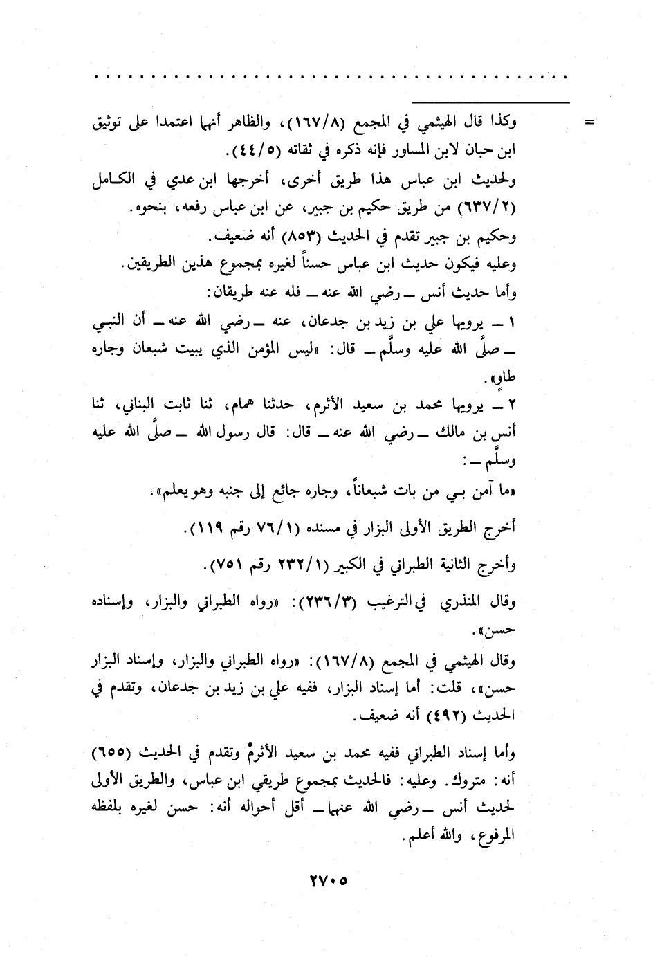 وأما إسناد الطبراني ففيه محمد بن سعيد الأثرم وتقدم في الحديث (655) أنه: متروك. وعليه: فالحديث بمجموع طريقي ابن عباس، والطريق الأولى لحديث أنس -رضى الله عنهما- أقل أحواله أنه: حسن لغيره بلفظه المرفوع: والله أعلم.