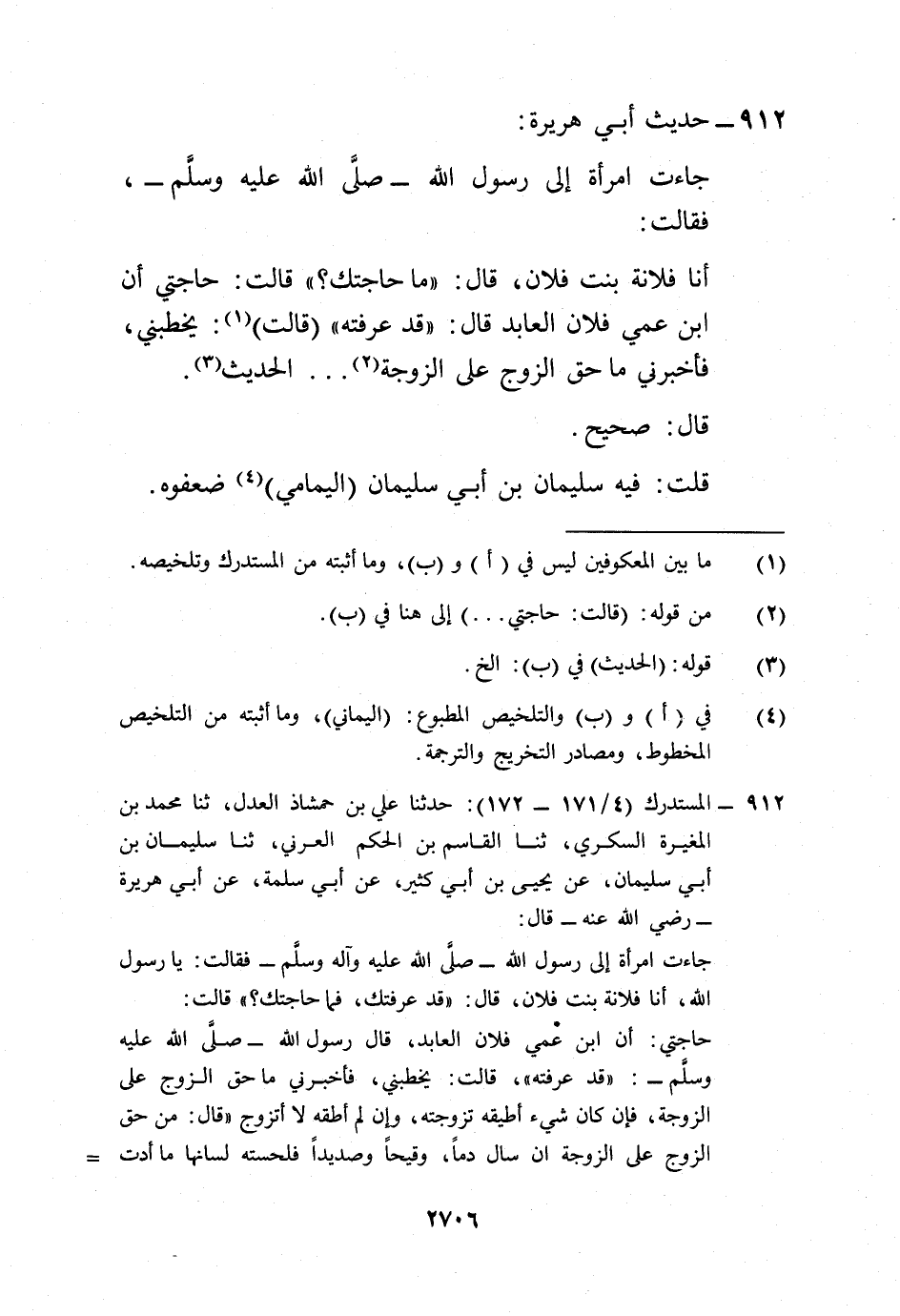 912 - المستدرك (4/ 171 - 172): حدثنا علي بن حمشاذ العدل، ثنا محمد بن المغيرة السكري، ثنا القاسم بن الحكم العرني، ثنا سليمان بن أبي سليمان، عن يحيى بن أبي كثير، عن أبي سلمة، عن أبي هريرة -رضي الله عنه- قال: