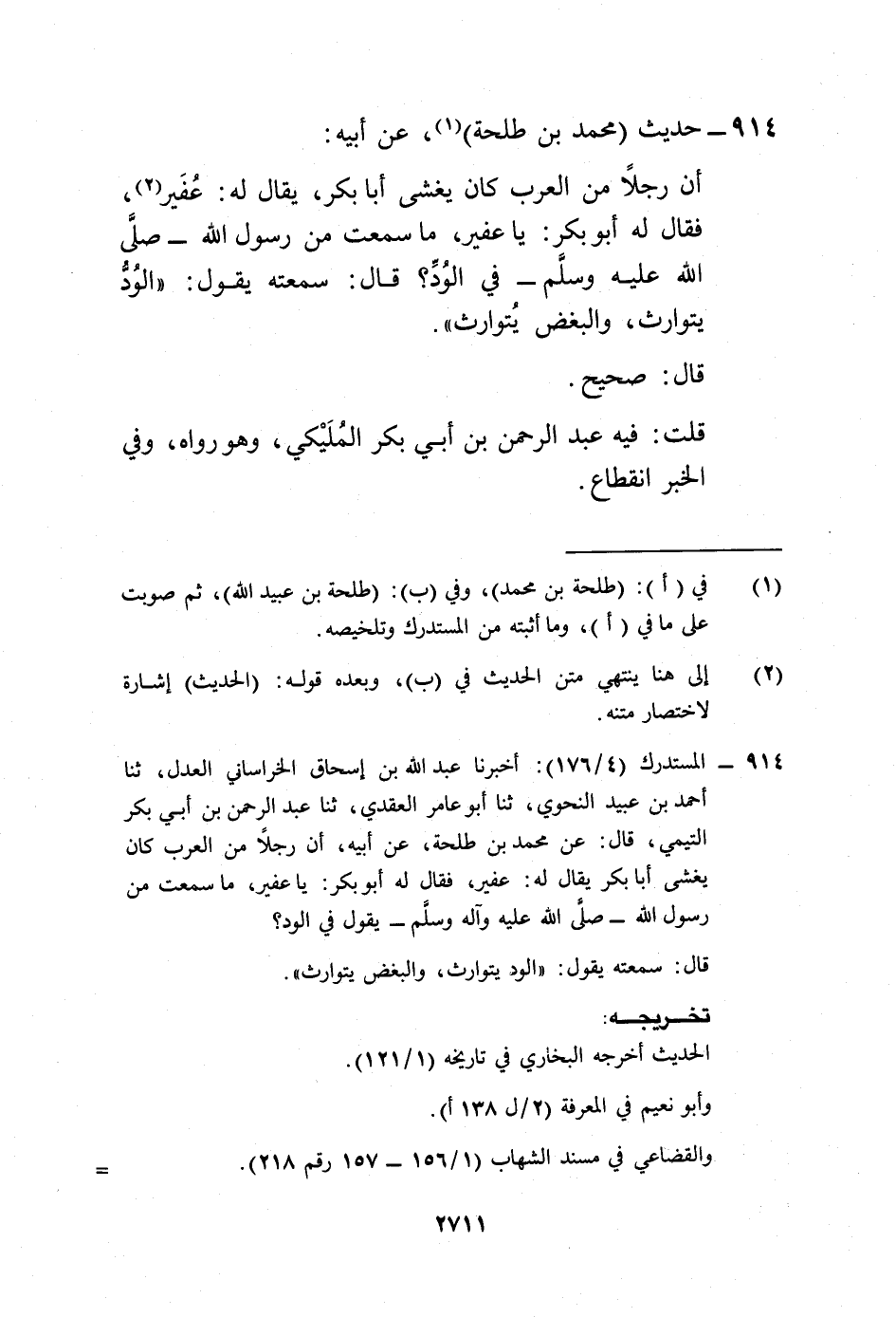 914 - المستدرك (4/ 176): أخبرنا عبد الله بن إسحاق الخراساني العدل، ثنا أحمد بن عبيد النحوي، ثنا أبو عامر العقدي، ثنا عبد الرحمن بن أبي بكر التيمي، قال: عن محمد بن طلحة، عن أبيه، أن رجلاً من العرب كان يغشى أبا بكر يقال له: عفير، فقال له أبو بكر: يا عفير، ما سمعت من رسول الله -صلى الله عليه وآله وسلم- يقول في الود؟
