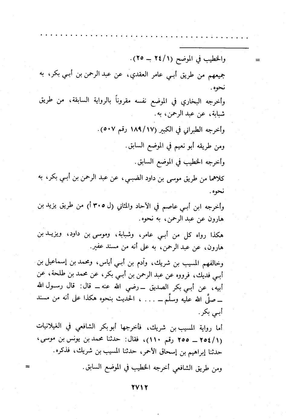 وخالفهم المسيب بن شريك، وآدم بن أبي أياس، ومحمد بن إسماعيل بن أبي فديك، فرووه عن عبد الرحمن بن أبي بكر، عن محمد بن طلحة، عن أبيه، عن أبي بكر الصديق -رضي الله عنه- قال: قال رسول الله -صلى الله عليه وسلم- .... ، الحديث بنحوه هكذا على أنه من مسند أبي بكر.