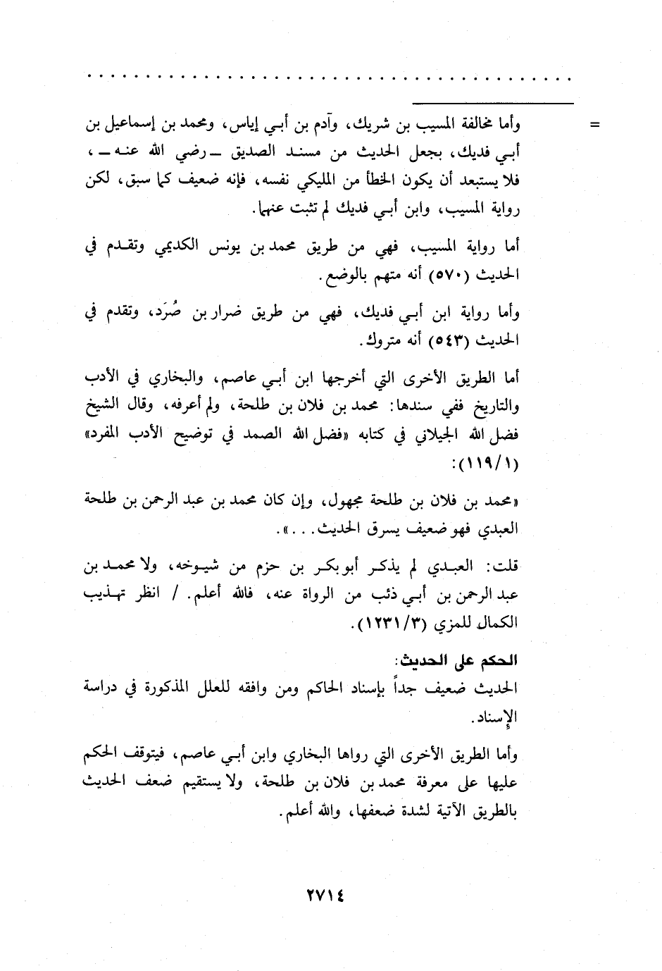 "محمد بن فلان بن طلحة مجهول، وإن كان محمد بن عبد الرحمن بن طلحة العبدي فهو ضعيف يسرق الحديث ... ".