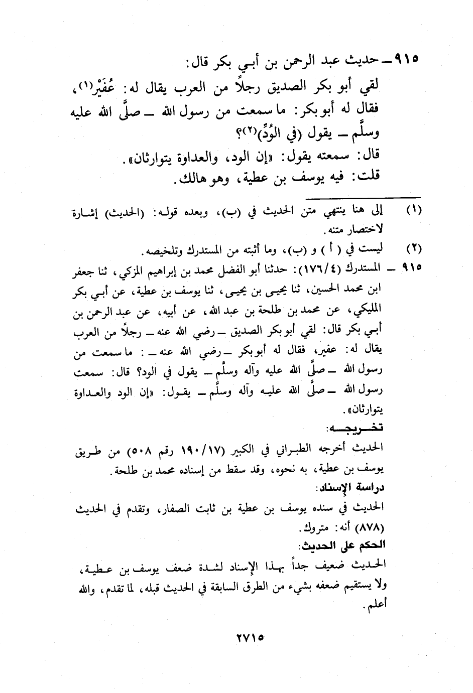 915 - المستدرك (4/ 176): حدثنا أبو الفضل محمد بن إبراهيم المزكي، ثنا جعفر ابن محمد الحسين، ثنا يحيى بن يحيى، ثنا يوسف بن عطية، عن أبي بكر المليكي، عن محمد بن طلحة بن عبد الله، عن أبيه، عن عبد الرحمن بن أبي بكر قال: لقي أبو بكر الصديق -رضي الله عنه- رجلاً من العرب يقال له: عفير، فقال له أبو بكر -رضي الله عنه-: ما سمعت من رسول الله -صلى الله عليه وآله وسلم- يقول في الود؟ قال: سمعت رسول الله -صلى الله عليه وآله وسلم- يقول: "إن الود والعداوة يتوارثان".
