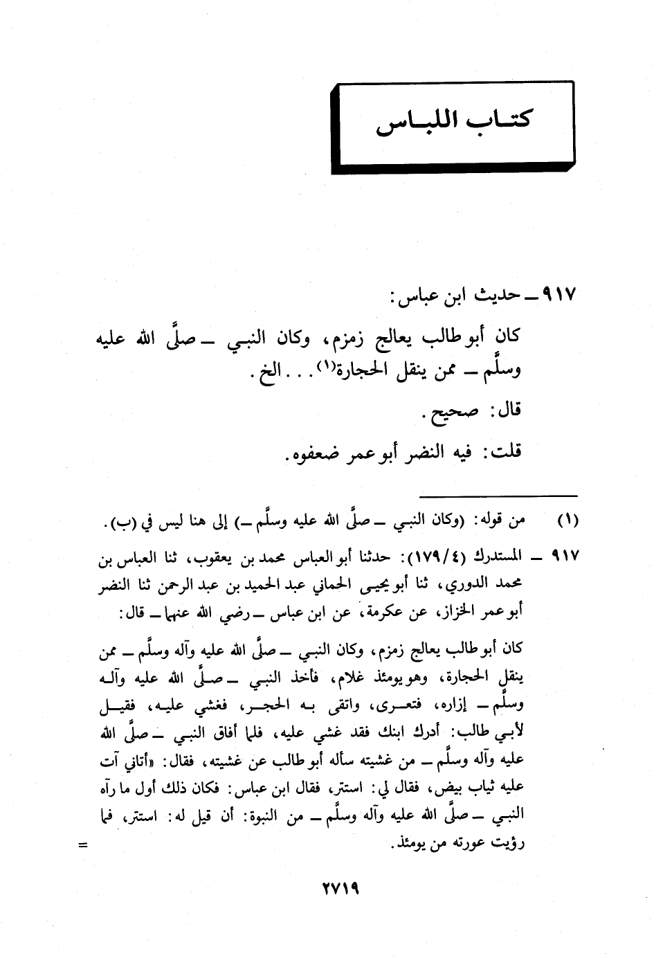 917 - المستدرك (4/ 179): حدثنا أبو العباس محمد بن يعقوب، ثنا العباس بن محمد الدوري، ثنا أبو يحيى الحماني عبد الحميد بن عبد الرحمن ثنا النضر أبو عمر الخزاز، عن عكرمة، عن ابن عباس -رضي الله عنهما- قال: