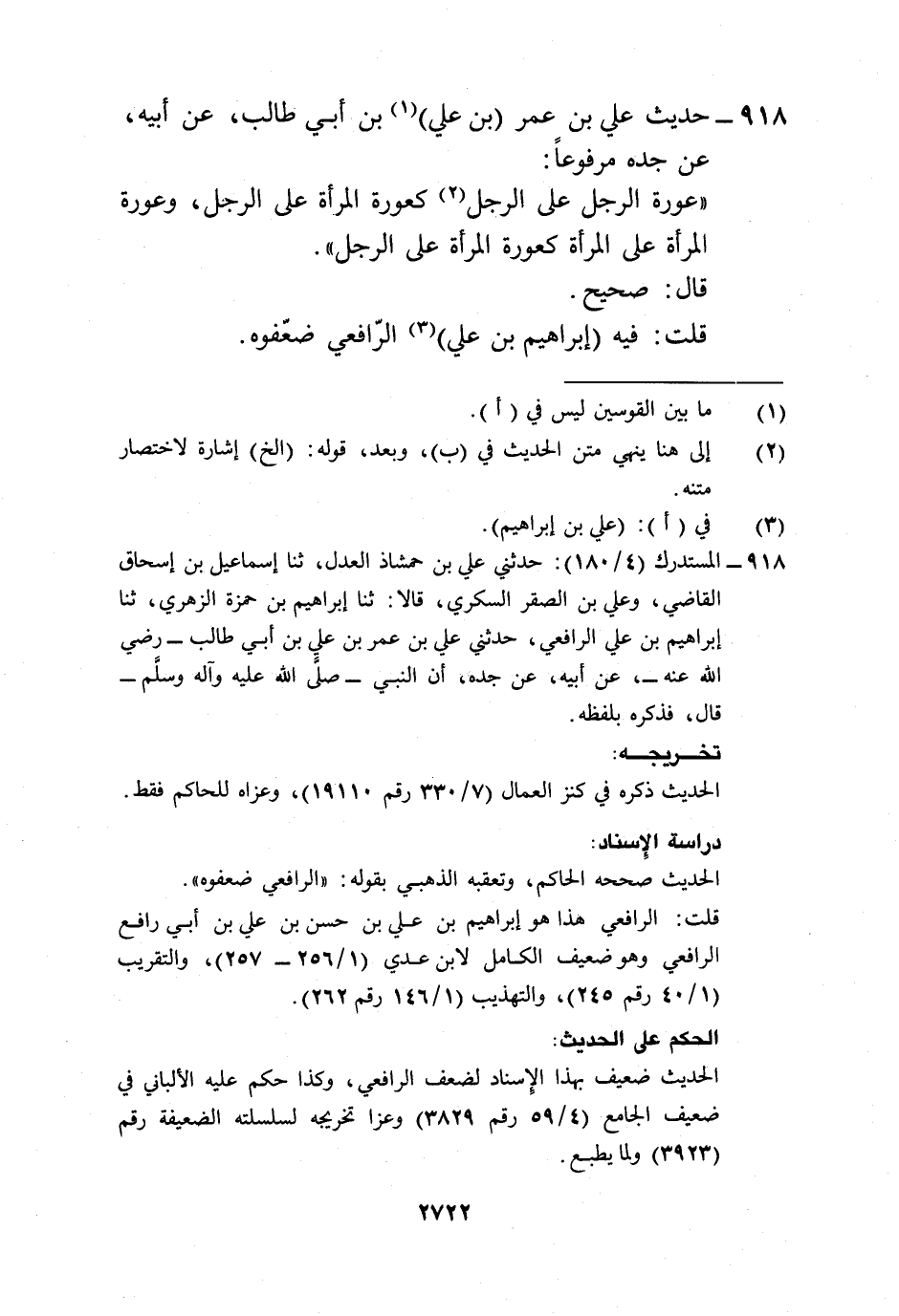 918 - المستدرك (4/ 180): حدثني علي بن حمشاذ العدل، ثنا إسماعيل بن إسحاق القاضي، وعلي بن الصقر السكري، قالا: ثنا إبراهيم بن حمزة الزهري، ثنا إبراهيم بن علي الرافعي، حدثني علي بن عمر بن علي بن أبي طالب -رضي الله عنه-، عن أبيه، عن جله، أن النبي -صلى الله عليه وآله وسلم- قال، فذكره بلفظه.