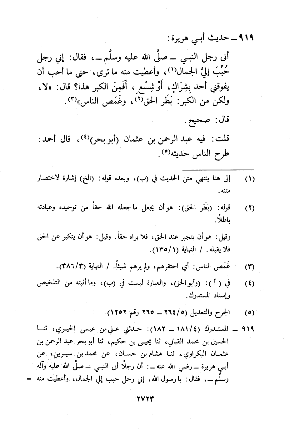 919 - المستدرك (4/ 181 - 182): حدثني علي بن عيسى الحيري، ثنا الحسن بن محمد القباني، ثنا يحيى بن حكيم، ثنا أبو بحر عبد الرحمن بن عثمان البكراوي، ثنا هشام بن حسان، عن محمد بن سيرين، عن أبي هريرة -رضي الله عنه-: أن رجلاً أتى النبي -صلى الله عليه وآله وسلم-، فقال: يا رسول الله، إني رجل حبب إلي الجمال، وأعطيت منه =