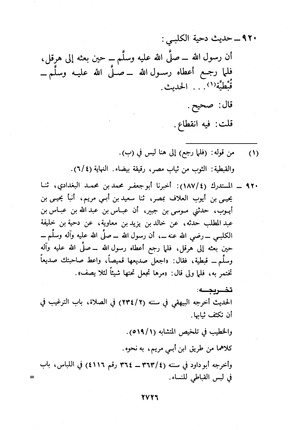920 - المستدرك (4/ 187): أخبرنا أبو جعفر محمد بن محمد البغدادي، ثنا يحيى بن أيوب العلاف بمصر، ثنا سعيد بن أبي مريم، أنبأ يحيى بن أيوب، حدثني موسى بن جبير، أن عباس بن عبد الله بن عباس بن عبد المطلب حدثه، عن خالد بن يزيد بن معاوية، عن دحية بن خليفة الكلبي -رضي الله عنه-، أن رسول الله -صلى الله عليه وآله وسلم- حين بعثه إلى هرقل، فلما رجع أعطاه رسول الله -صلى الله عليه وآله وسلم- قبطية، فقال: "اجعل صديعها قميصاً، واعط صاحبتك صديعاً تختمر به، فلما ولى قال: "مرها تجعل تحتها شيئاً لئلا يصف".