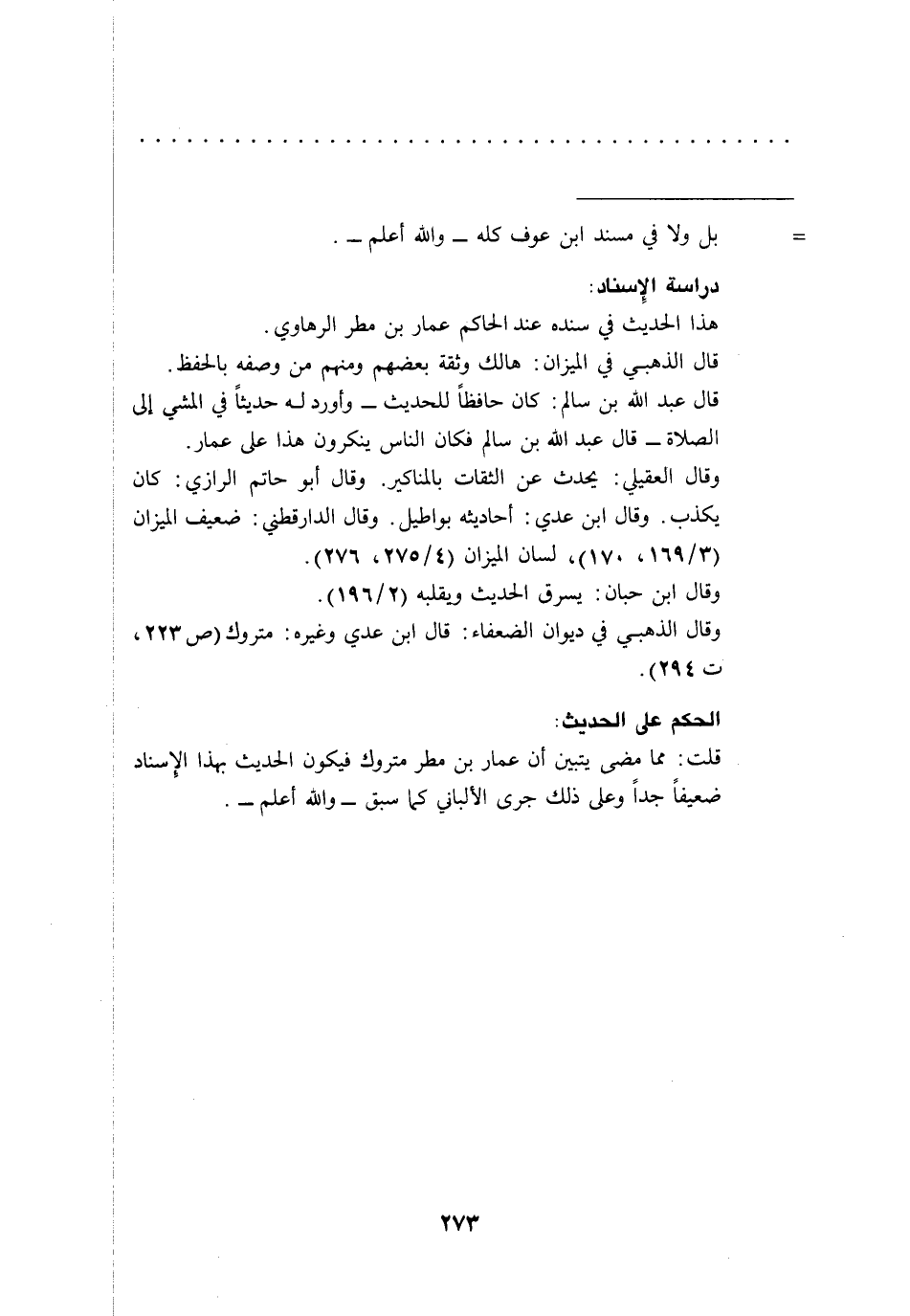 قلت: مما مضى يتبين أن عمار بن مطر متروك فيكون الحديث بهذا الِإسناد ضعيفاً جداً وعلى ذلك جرى الألباني كما سبق -والله أعلم-.
