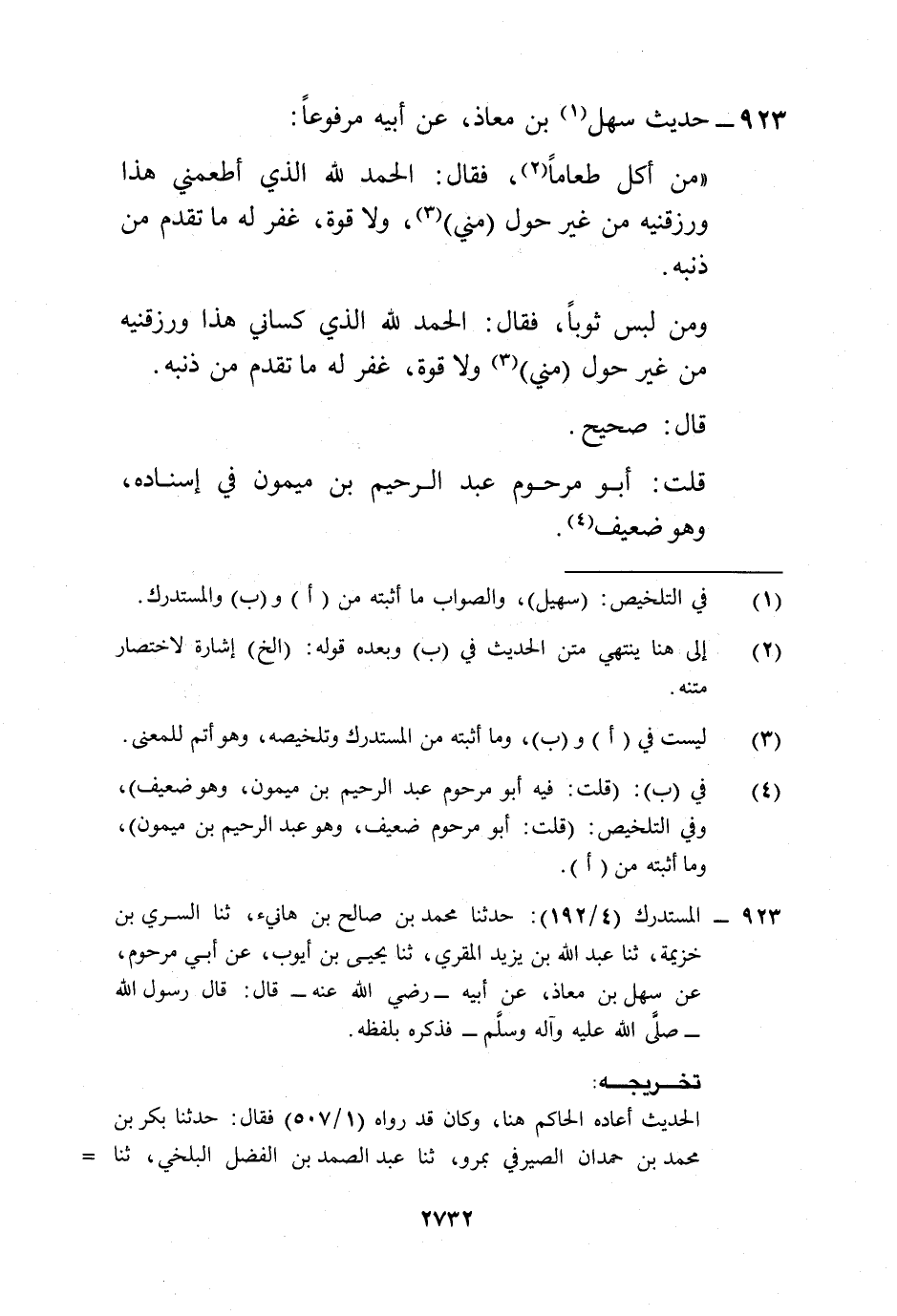 923 - المستدرك (4/ 192): حدثنا محمد بن صالح بن هانيء، ثنا السري بن خزيمة، ثنا عبد الله بن يزيد المقري، ثنا يحيى بن أيوب، عن أبي مرحوم، عن سهل بن معاذ، عن أبيه -رضي الله عنه- قال: قال رسول الله -صلى الله عليه واله وسلَّم- فذكره بلفظه.