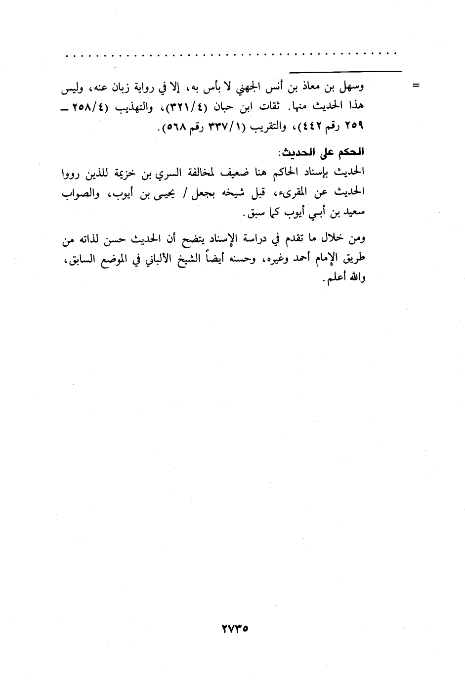 الحديث بإسناد الحاكم هنا ضعيف لمخالفة السري بن خزيمة للذين رووا الحديث عن المقرىء، قبل شيخه بجعل/ يحيى بن أيوب، والصواب سعيد بن أبي أيوب كما سبق.