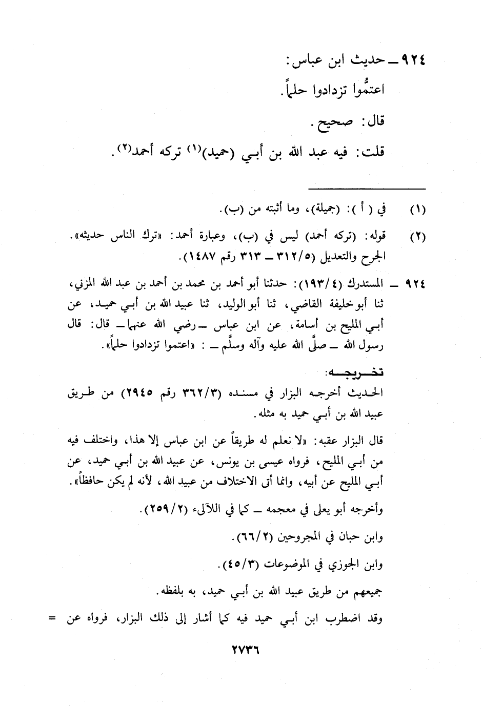924 - المستدرك (4/ 193): حدثنا أبو أحمد بن محمد بن أحمد بن عبد الله المزني، ثنا أبو خليفة القاضي، ثنا أبو الوليد، ثنا عبيد الله بن أبي حميد، عن أبي المليح بن أسامة، عن ابن عباس -رضي الله عنهما- قال: قال رسول الله -صلَّى الله عليه وآله وسلم-: "اعتموا تزدادوا حلماً".