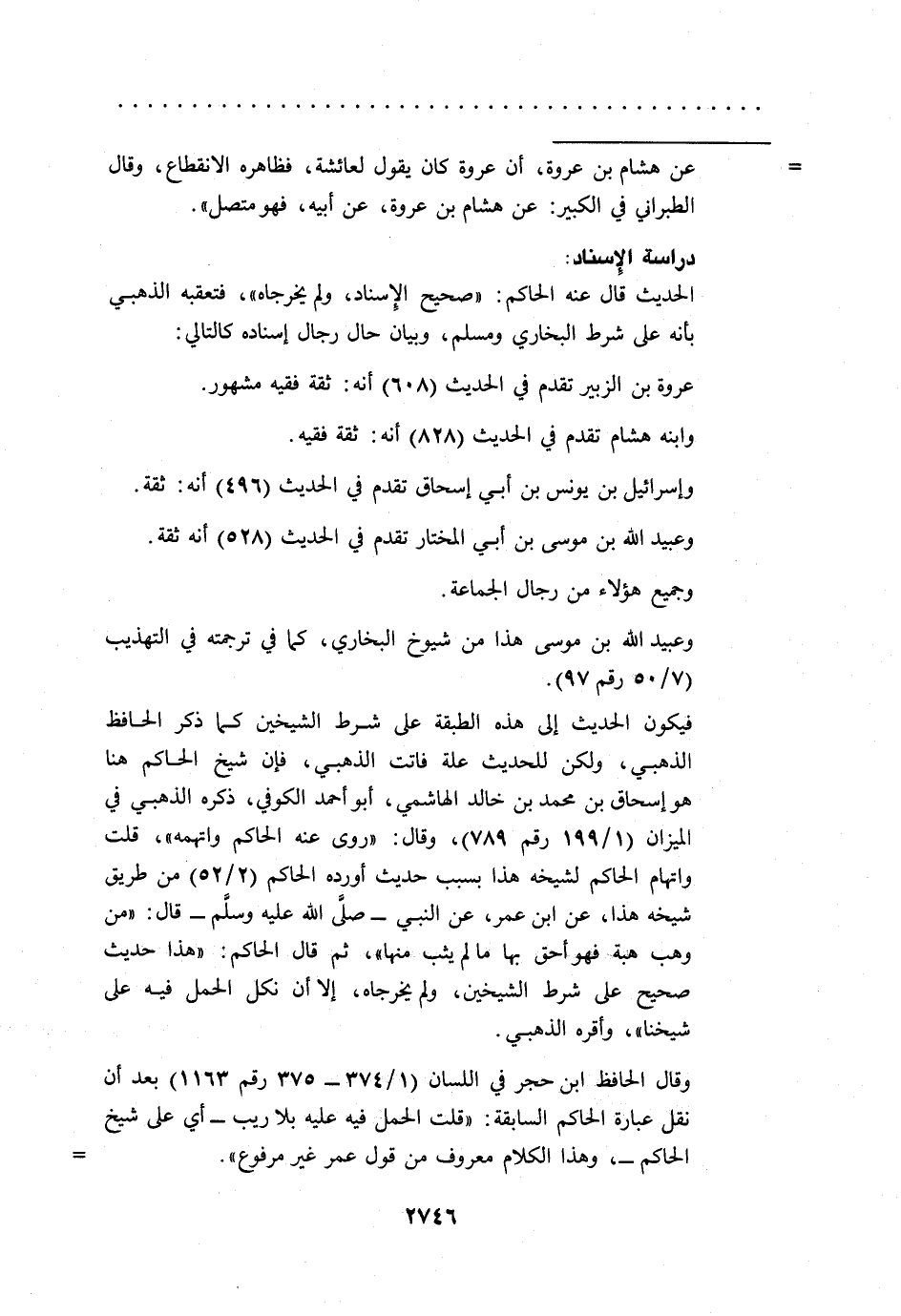 = عن هشام بن عروة، أن عروة كان يقول لعائشة، فظاهره الانقطاع، وقال الطبراني في الكبير: عن هشام بن عروة، عن أبيه، فهو متصل".