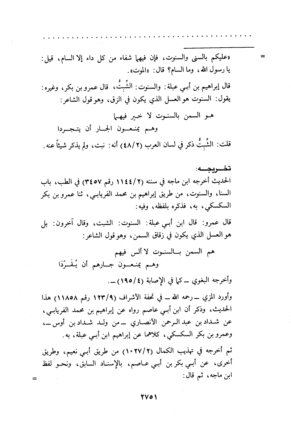 = "عليكم بالسنى والسنوت، فإن فيهما شفاء من كل داء إلا السام، قيل: يا رسول الله، وما السام؟ قال: "الموت".