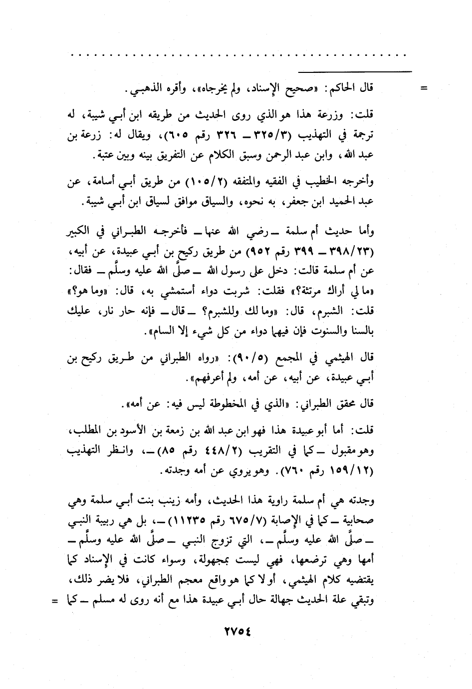 وأما حديث أم سلمة -رضي الله عنها- فأخرجه الطبراني في الكبير (23/ 398 - 399 رقم 952) من طريق ركيح بن أبي عبيدة، عن أبيه، عن أم سلمة قالت: دخل على رسول الله -صلى الله عليه وسلم- فقال: "ما لي أراك مرتثة؟ " فقلت: شربت دواء أستمشي به، قال: "وما هو؟ " قلت: الشبرم، قال: "وما لك وللشبرم؟ -قال- فإنه حار نار، عليك بالسنا والسنوت فإن فيهما دواء من كل شيء إلا السام".